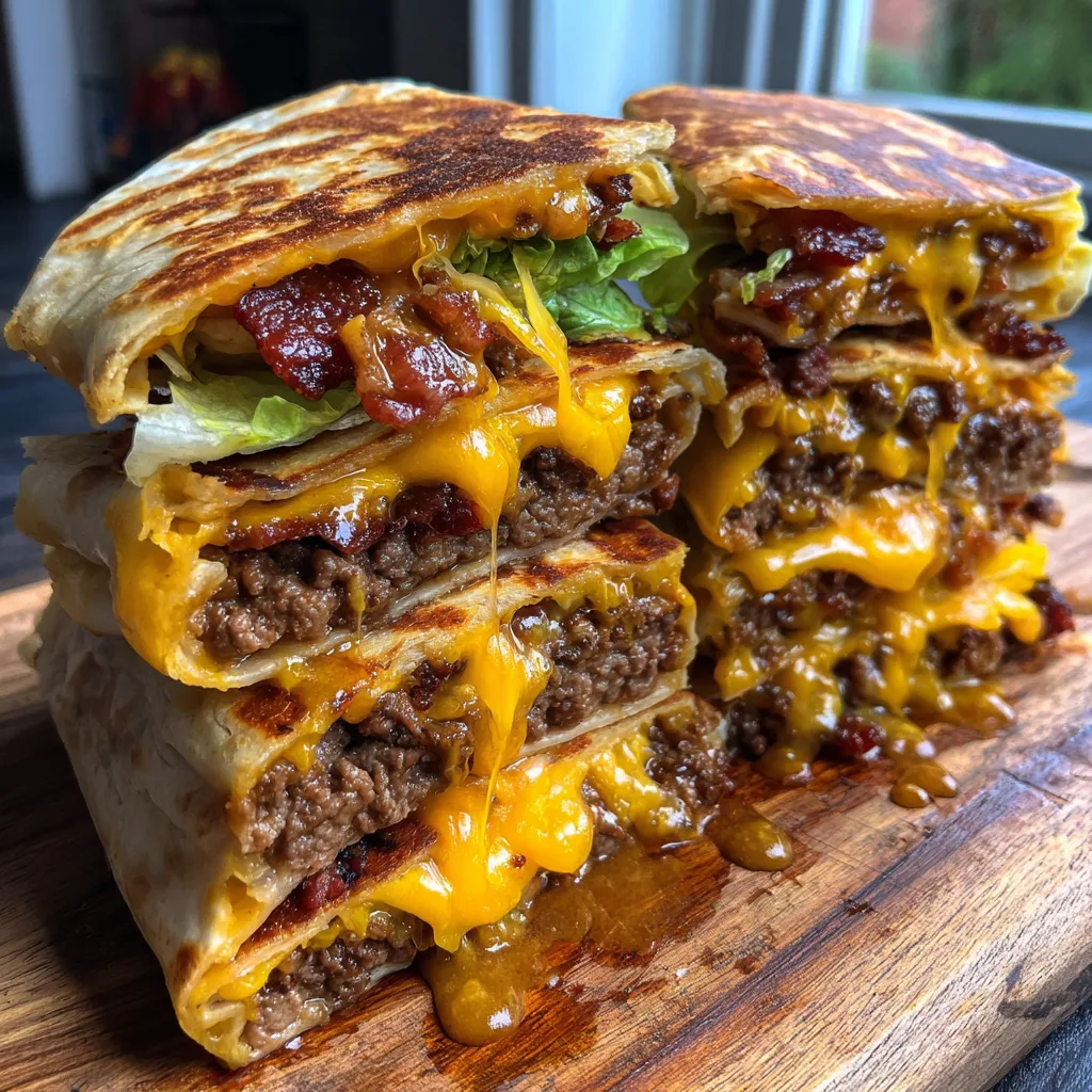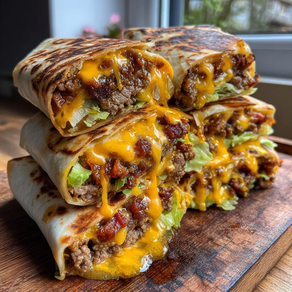This ingenious recipe takes all the familiar, beloved flavors of a premium diner burger and packages them neatly inside a warm, toasted flour tortilla. By utilizing simple, high-quality ingredients—specifically 1 lb of savory ground beef, 8 slices of crispy cooked bacon, and a generous 1 cup of rich shredded cheddar cheese—you create a handheld meal that is both incredibly indulgent and surprisingly easy to manage. Whether you are feeding a crowd of hungry kids after soccer practice or treating yourself to a decadent weekend dinner, these wraps deliver massive flavor with minimal fuss.