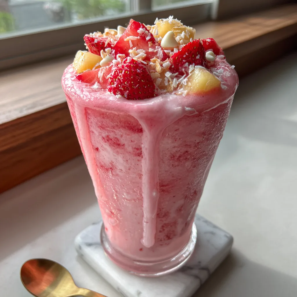 - 6. Garnish and serve: Pour the smoothie into a tall, preferably chilled, glass. Top with a sprinkle of extra shredded coconut, a few white chocolate chips, a slice of fresh strawberry, and a piece of pineapple. Serve immediately with a wide straw.