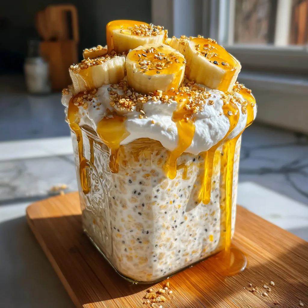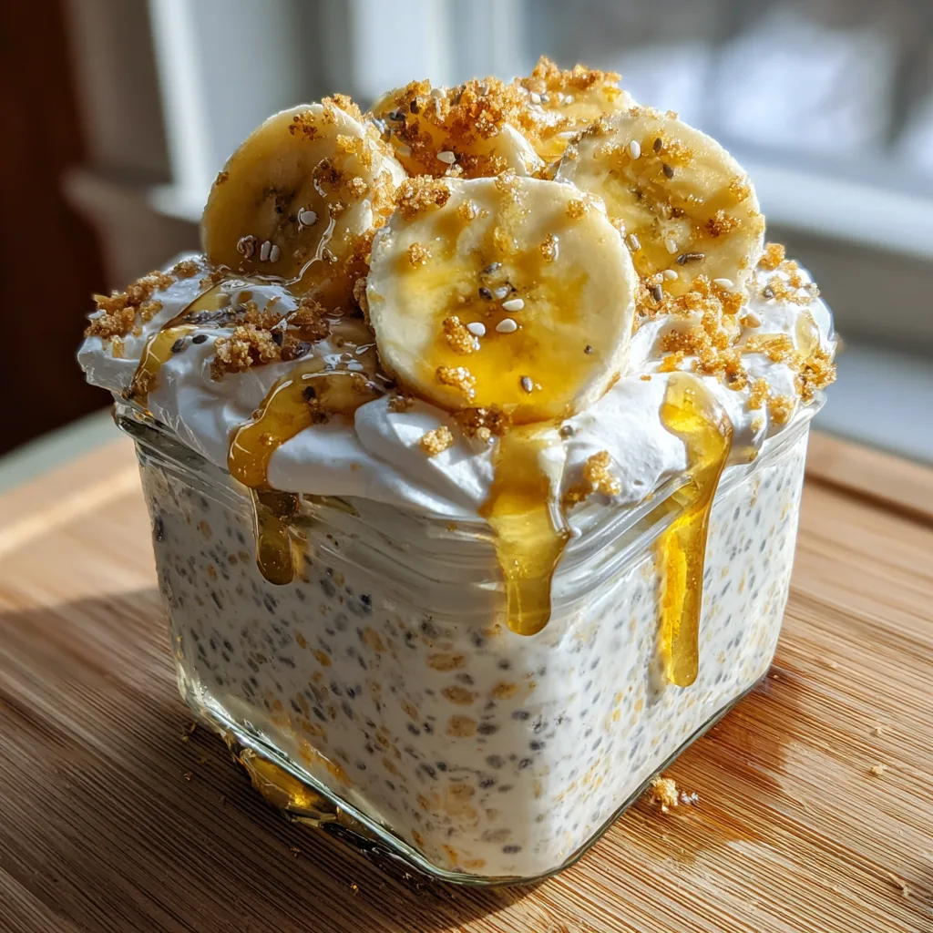 - Garnish and Serve: The next morning, remove your jar from the fridge. Give it a good stir. If the mixture is too thick for your liking, you can stir in an extra splash of milk until you reach your desired consistency. Top the oats with the remaining sliced banana, a dollop of whipped cream, and a generous sprinkle of crushed graham crackers or seeds. Enjoy immediately cold, or warm it slightly in the microwave if you prefer.