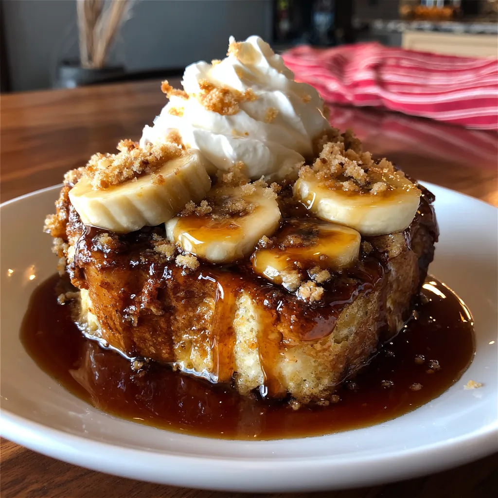 A decadent overnight-style breakfast bake featuring layers of bread, sliced bananas, and rich custard, all topped with a crunchy brown sugar streusel.