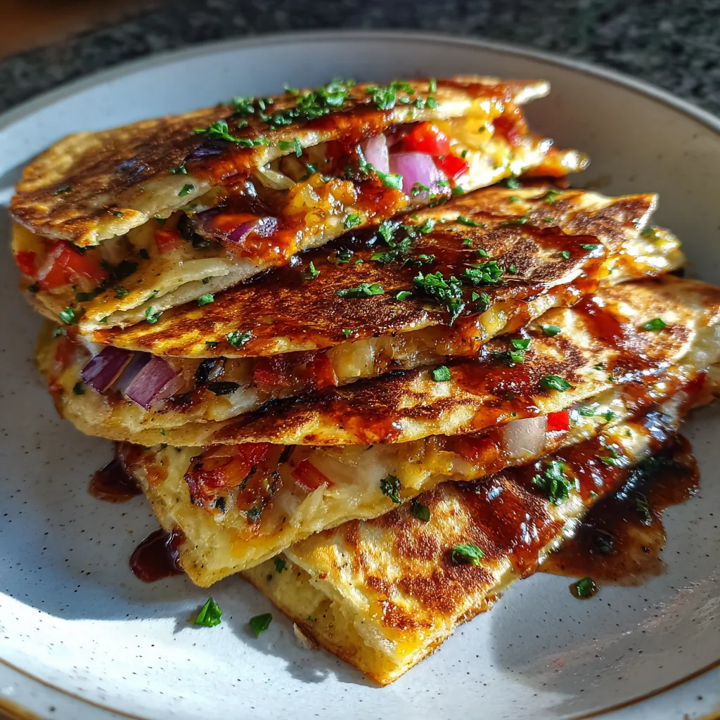 Cut the quesadilla into wedges. Stack them on a plate. Drizzle generously with extra BBQ sauce (warmed up slightly helps it flow). Sprinkle with freshly chopped parsley or cilantro.