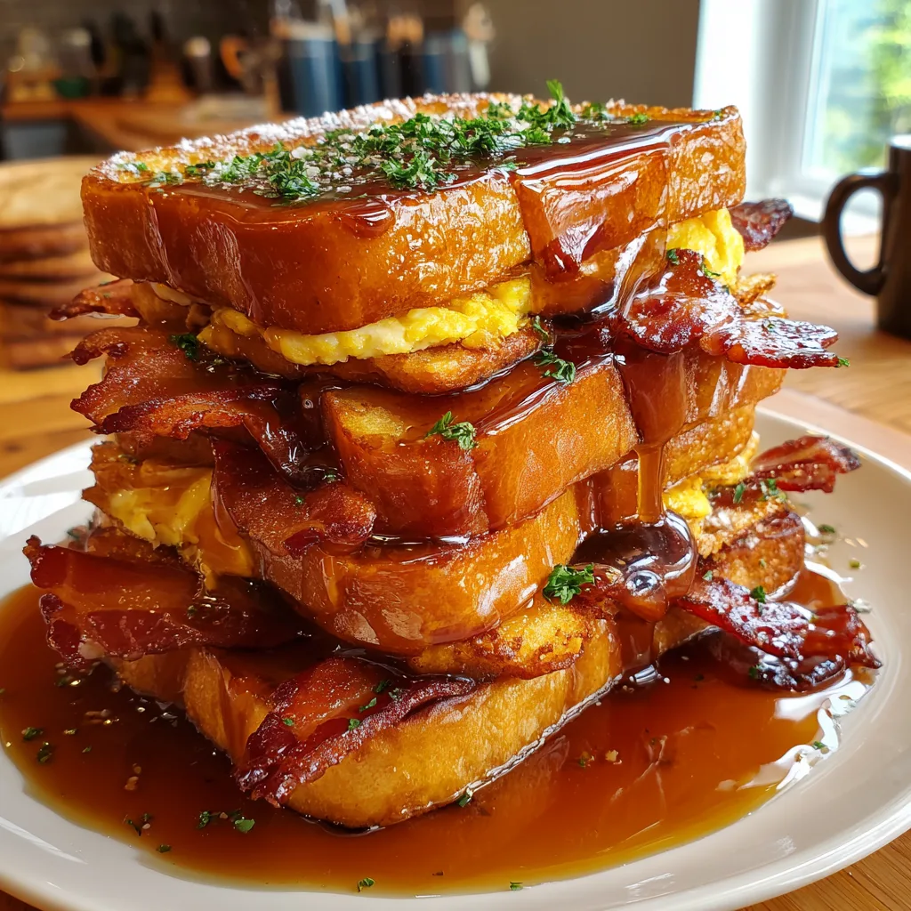 - Assemble the sandwiches by placing scrambled eggs and crispy bacon between two slices of the cooked French toast.
