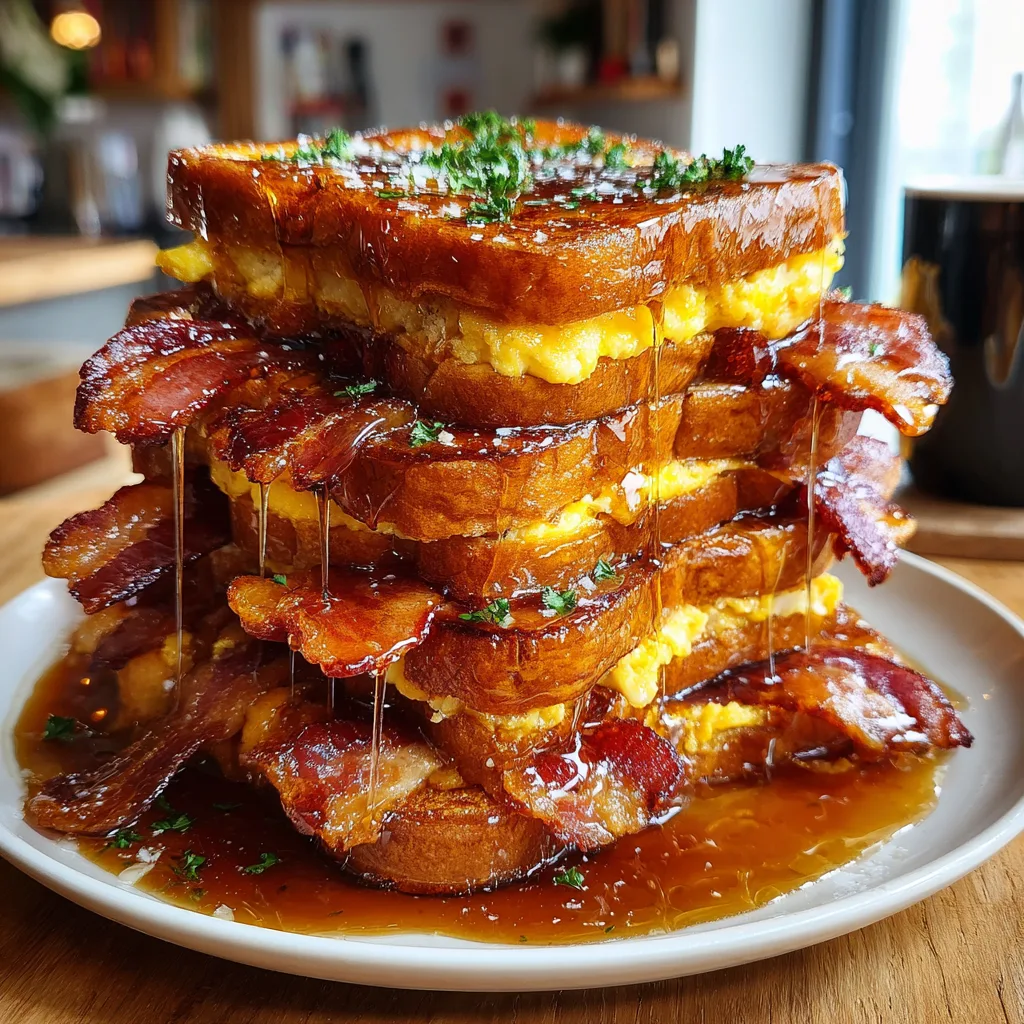 There is a magical culinary space where the boundary between breakfast and dessert beautifully blurs, and that space is entirely occupied by the magnificent Bourbon Maple Bacon Stuffed Toast. If you have ever found yourself torn between ordering a stack of sweet, syrupy pancakes or a savory, salty bacon and egg sandwich at your favorite weekend diner, this recipe is your ultimate compromise. Actually, calling it a compromise does not do it justice—it is an absolute upgrade. This dish takes the comforting, custardy richness of classic French toast, stuffs it to the brim with perfectly cooked eggs and crispy, smoky thick-cut bacon, and then drenches the entire towering masterpiece in a homemade, sticky, intoxicatingly delicious bourbon-infused maple syrup.