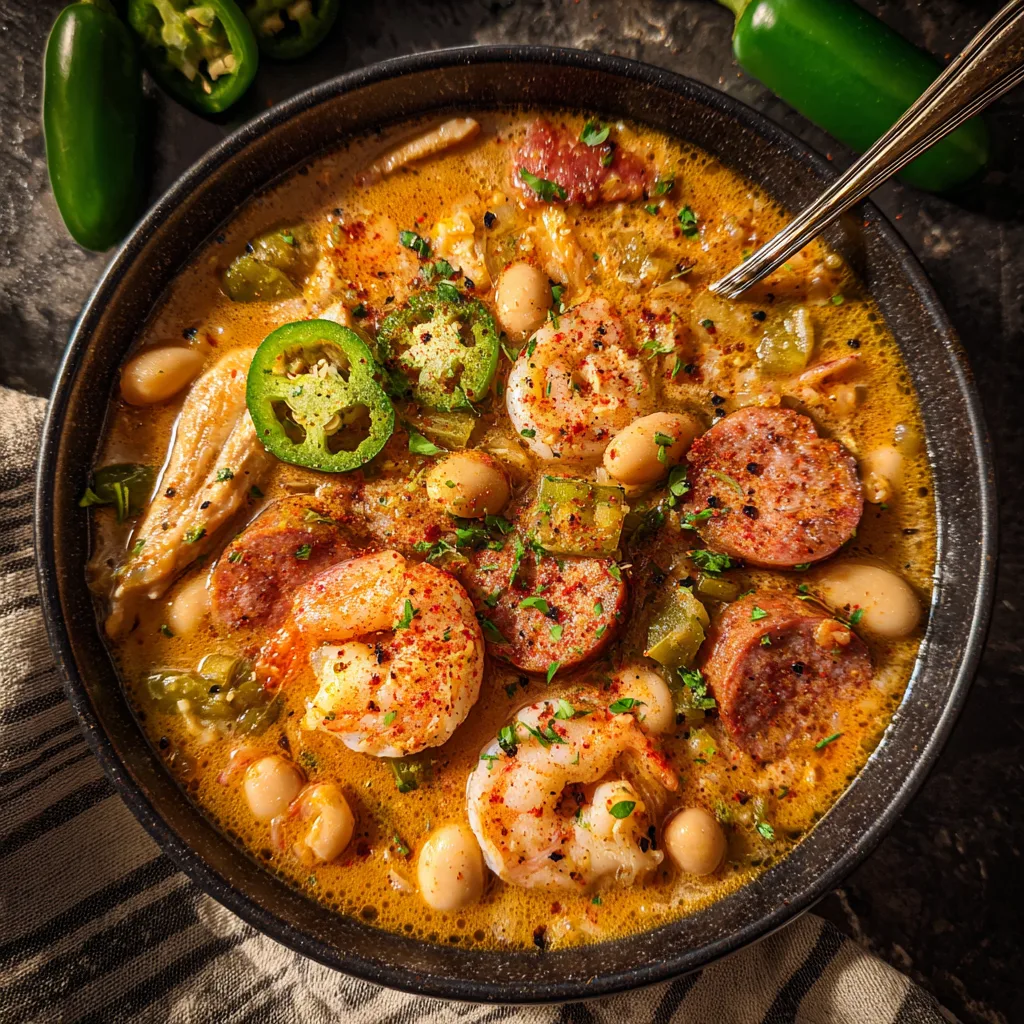 This isn’t your standard, mild-mannered white chili. By infusing the pot with the “Holy Trinity” of Cajun cooking (bell peppers, onions, and celery), adding thick slices of smoky andouille sausage, and finishing it off with a handful of plump shrimp, this dish blurs the line between a traditional white chili and a rich, hearty Louisiana gumbo. It is deeply savory, perfectly spiced, and boasts a luxurious, creamy broth that will have you eagerly scraping the bottom of your bowl for every last drop.