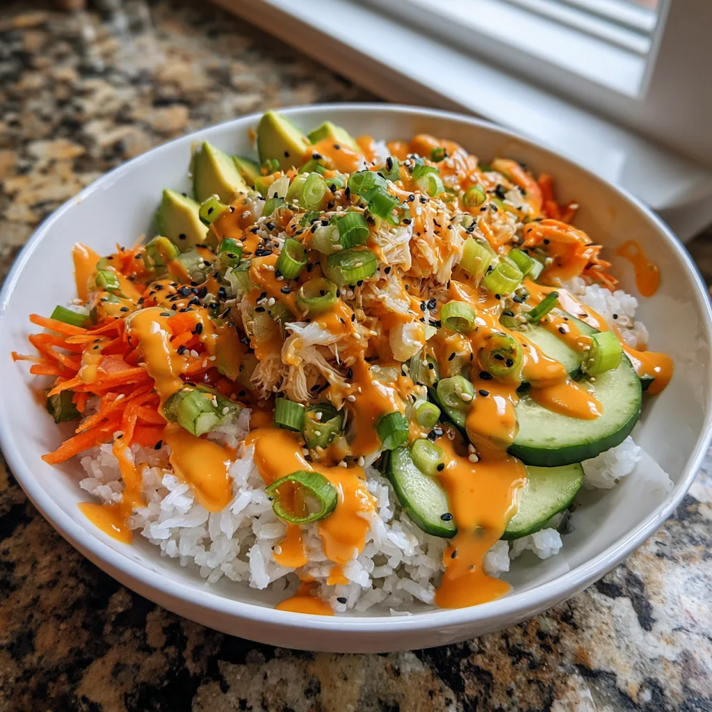 This California Crab Bowl is a masterclass in texture and flavor layering. We start with a base of fluffy, aromatic basmati rice, which provides a wonderfully light and distinct foundation. On top of that, we arrange a colorful mosaic of crisp cucumbers, crunchy diced carrots, creamy sliced avocado, and savory chopped imitation crab meat. A generous scattering of fresh green onions adds a sharp, grassy bite, while a shower of toasted sesame seeds brings a nutty crunch to every spoonful. Finally, the entire bowl is brought together with a heavy, luscious drizzle of homemade spicy mayo—a rich, creamy, and fiery sauce that coats every single ingredient and elevates the dish from a simple salad to a decadent, drool-worthy meal. Whether you are a sushi aficionado or simply someone looking for a fresh, healthy, and satisfying new recipe to add to your rotation, this bowl is guaranteed to become an instant favorite.