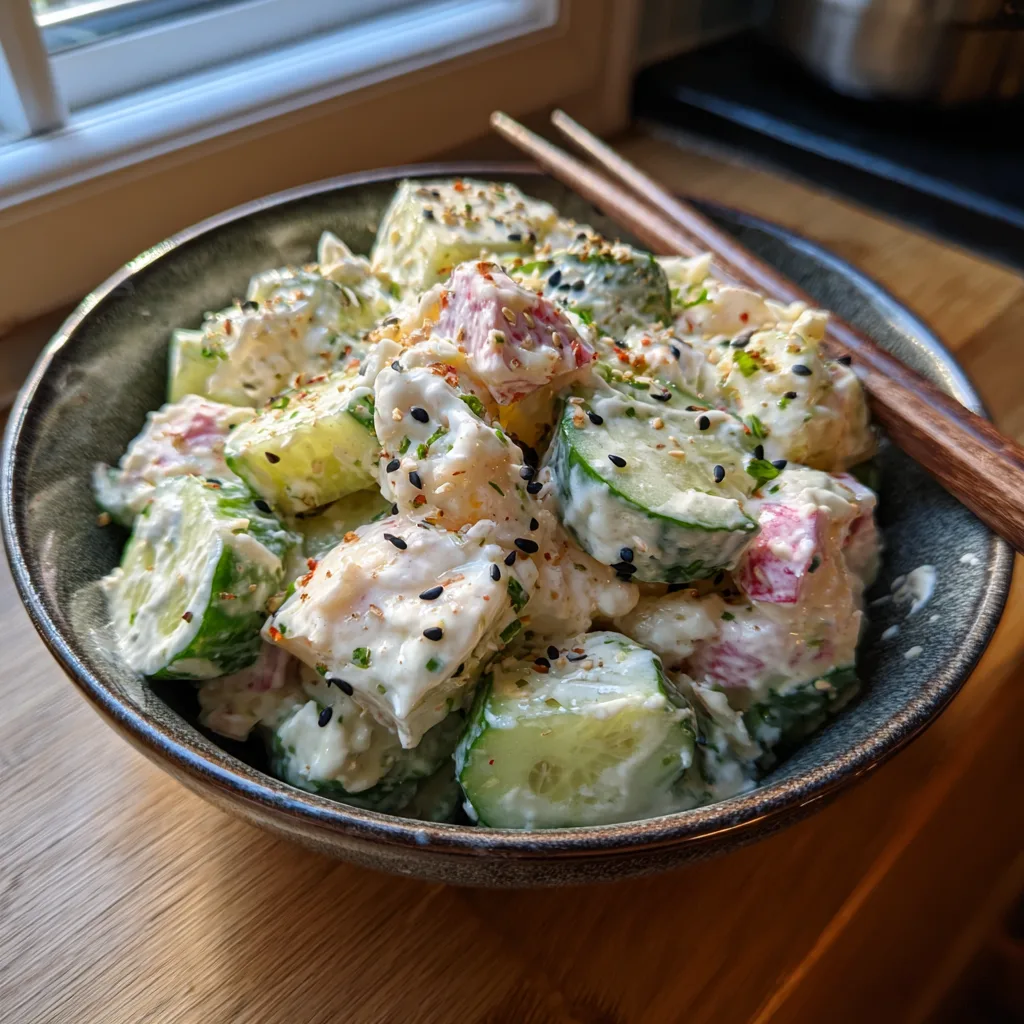What makes this specific salad stand out is the dressing. Unlike a standard vinaigrette, we use a blend of Japanese mayo and cream cheese to create a velvet-like coating that clings to every slice of cucumber. It is decadent yet fresh, a balance that is hard to find in most salad recipes.