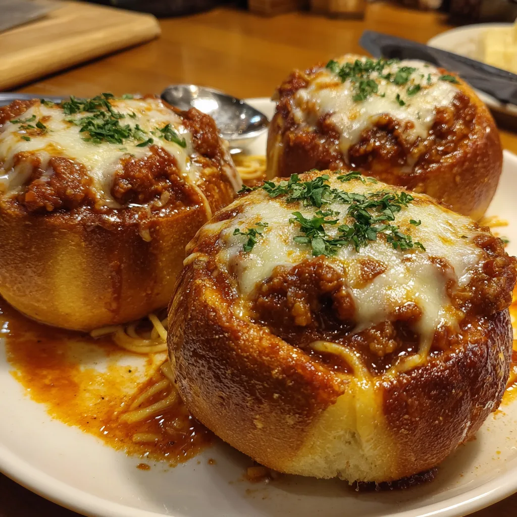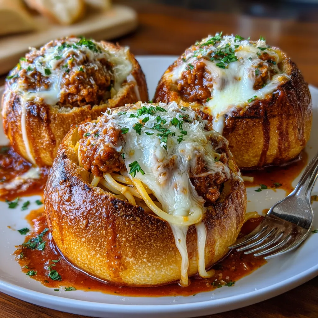 This dish transforms a standard weeknight spaghetti dinner into something spectacular. By hollowing out crusty bakery rolls and brushing them with a rich garlic herb butter, you create a sturdy, flavorful vessel for your pasta. The spaghetti is tossed in a robust meat sauce, stuffed inside, and crowned with a mountain of mozzarella that gets broiled to bubbly perfection. It is messy, indulgent, and guaranteed to be a hit with kids and adults alike.