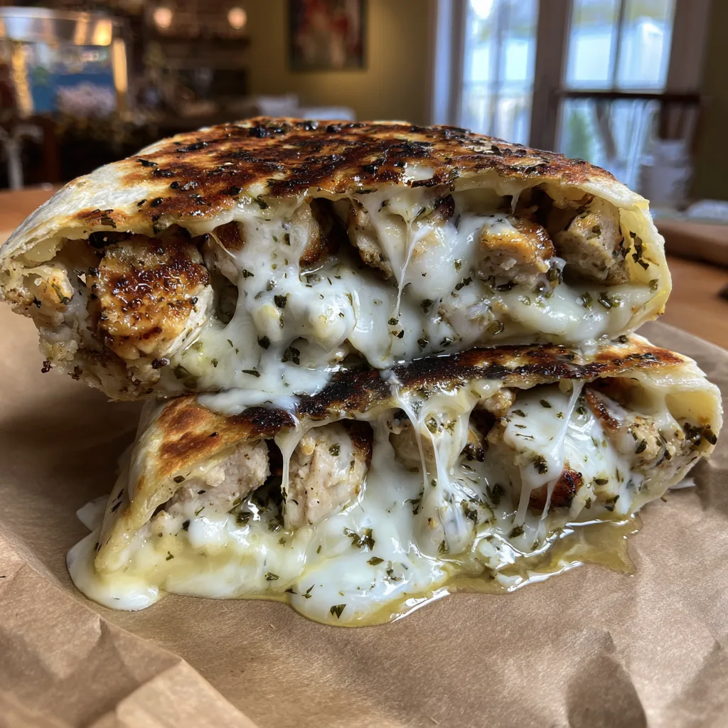 If you have been searching for a meal that perfectly bridges the gap between quick weeknight convenience and indulgent, restaurant-quality comfort food, your search ends right here. The Ooey-Gooey Cheesy Garlic Chicken Wrap is a masterpiece of culinary simplicity. Imagine tender, perfectly seasoned bites of chicken breast, enveloped in a blanket of molten, stretching mozzarella and provolone cheese, all hugged tightly by a golden, toasted tortilla that has been generously brushed with a rich garlic and herb butter. Every single bite offers a symphony of textures and flavors: the satisfying crunch of the grilled exterior, the savory and aromatic punch of the garlic, the comforting chew of the chicken, and the luxurious, rich pull of the melted cheese.