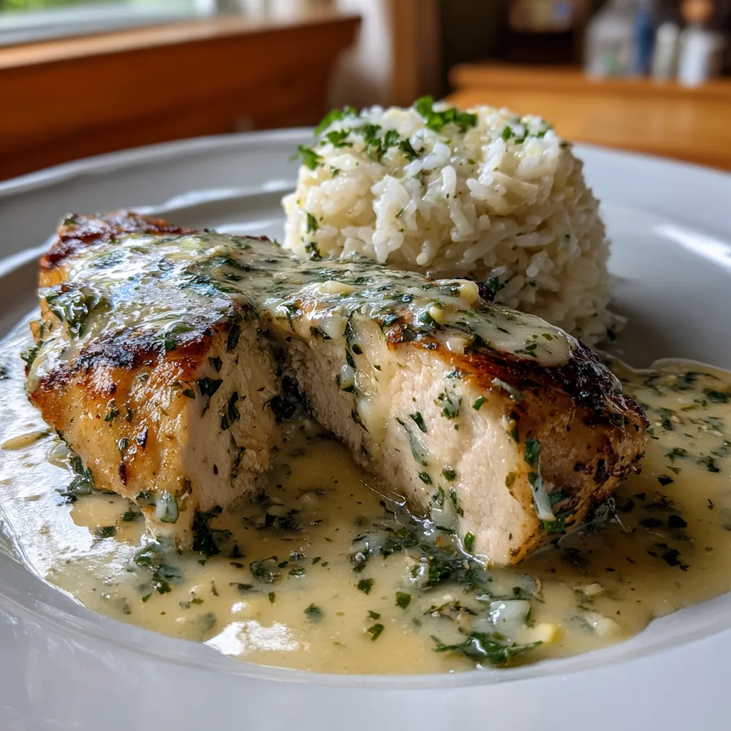 Tender, perfectly seared chicken breast strips in a velvety, garlicky, herby reduction, served over fluffy, aromatic garlic parmesan rice for a comforting and indulgent dinner.