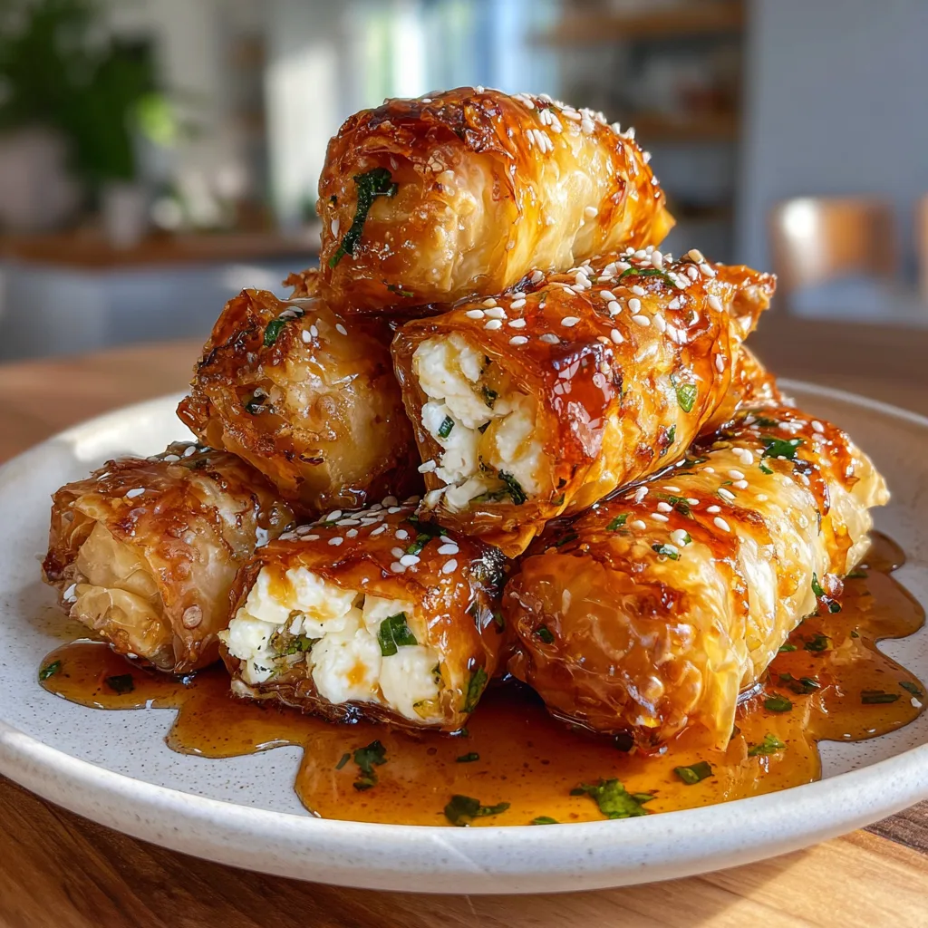 Crispy, golden-baked phyllo dough rolled around a creamy, savory feta and herb filling, drenched in an irresistible sweet and spicy hot honey glaze.
