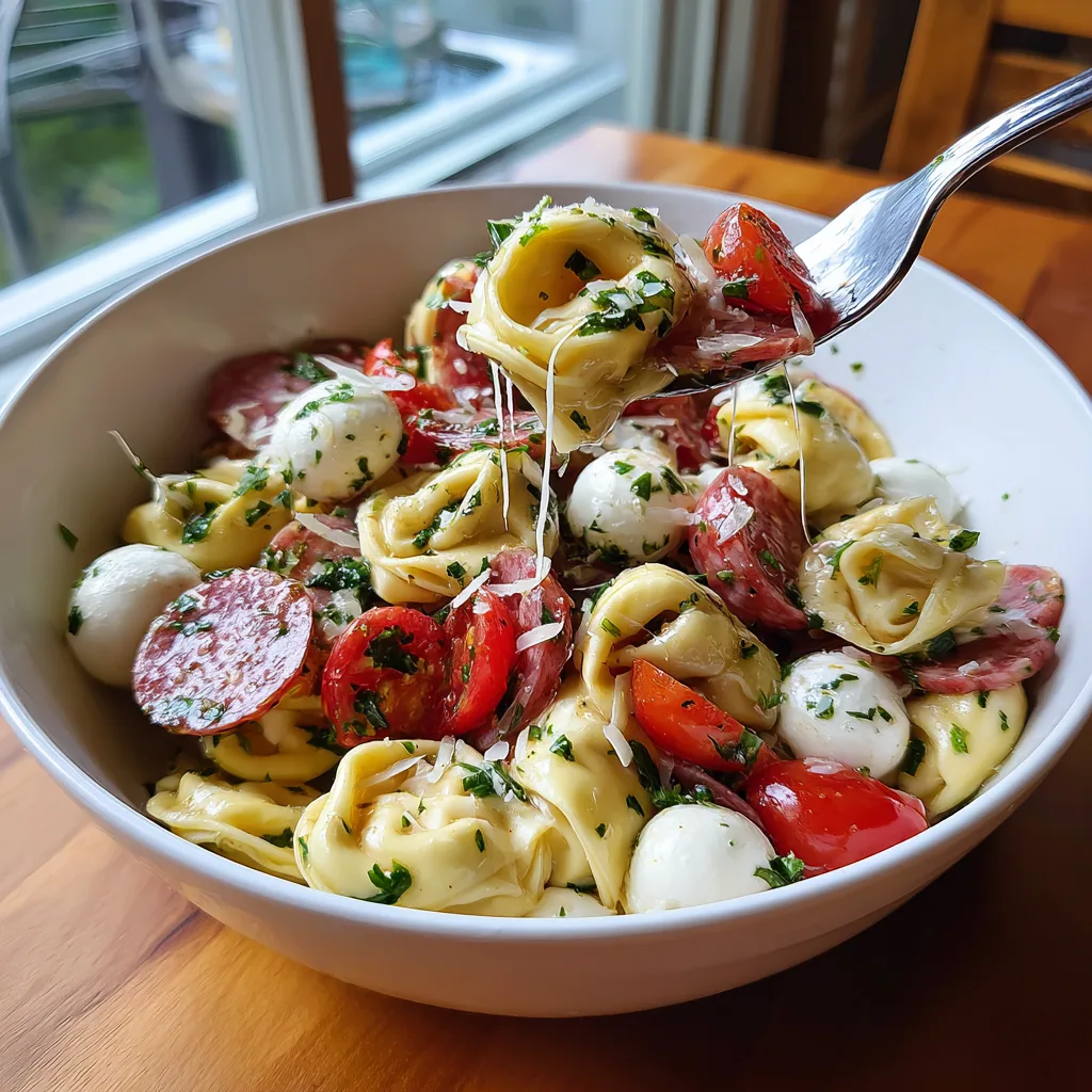 - In a large serving bowl, gently toss together the cooled tortellini, halved tomatoes, salami, mozzarella balls, and chopped parsley.