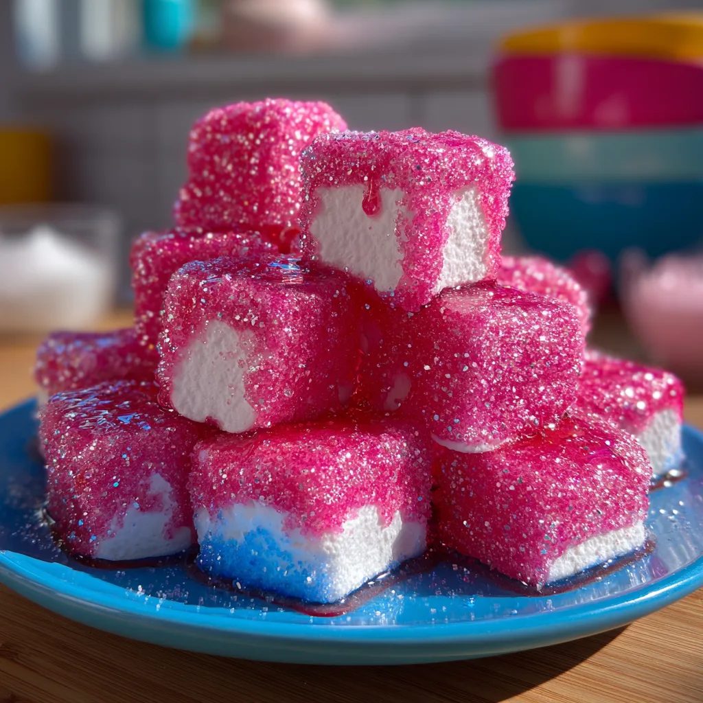 What makes these specific marshmallows stand out is their stunning visual presentation. They feature a bright blue center enveloped by a stark white exterior, all rolled in vibrant pink sugar. Achieving this look requires a bit of timing and technique.