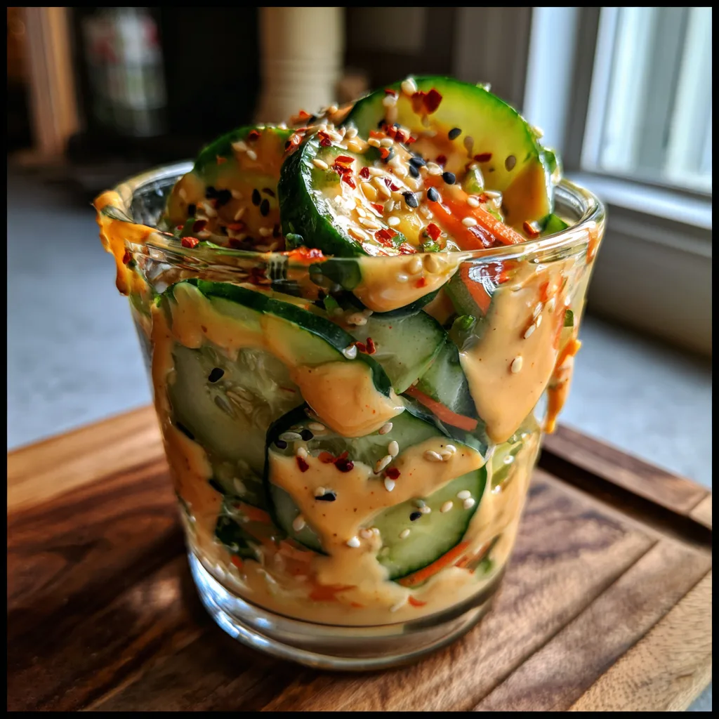 A crisp, refreshing, and incredibly flavorful cucumber salad tossed in a rich, spicy, and creamy sesame-mayo dressing. Ready in just 15 minutes!