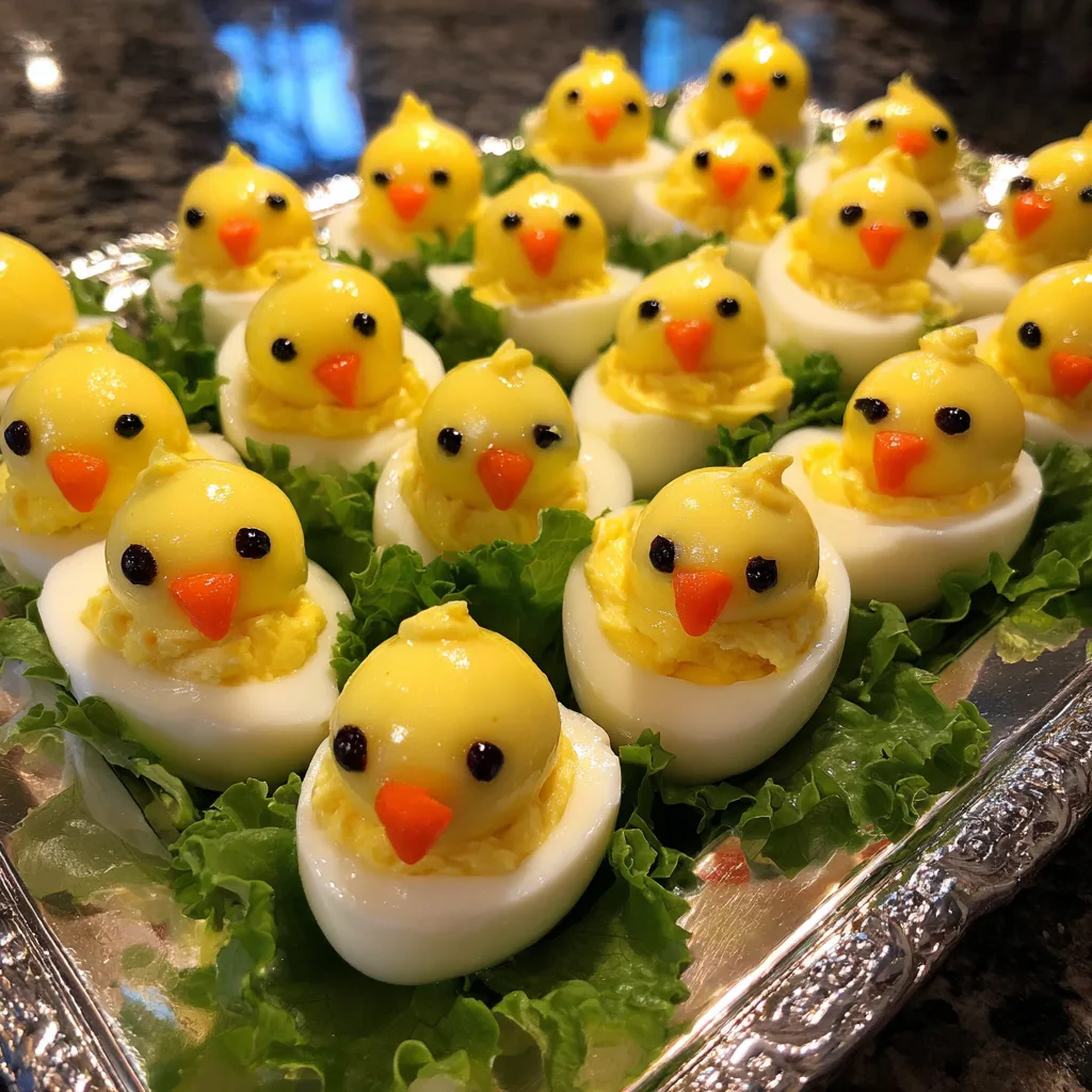 Classic deviled eggs reimagined into adorable hatching baby chicks, perfect for Easter and spring parties.