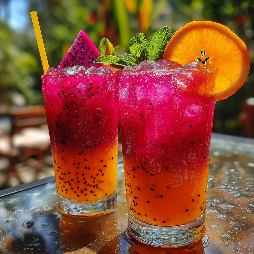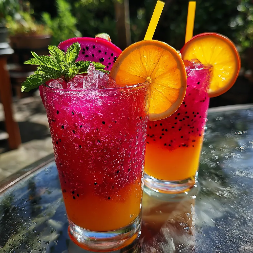 - Garnish each glass with a slice of orange, a piece of dragon fruit peel if available, and a fresh sprig of mint. Add a straw.