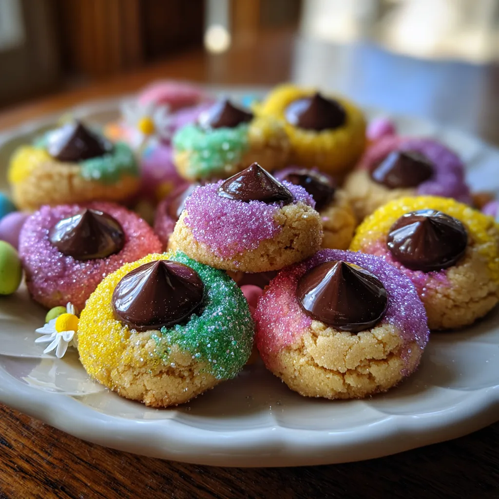 Peanut butter blossoms have been a staple in American baking for decades, and for good reason. The contrast between the soft, slightly chewy, intensely peanut-buttery cookie and the rich, solid bite of the milk chocolate kiss is a textural and flavor masterpiece. By simply swapping the traditional roll in white granulated sugar for a vibrant array of colored sanding sugars—think soft pinks, sunny yellows, mint greens, and lavender purples—you instantly transform an everyday cookie into an event. They look like little springtime jewels, yet they require virtually no extra effort to make.