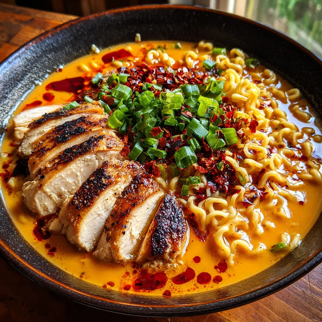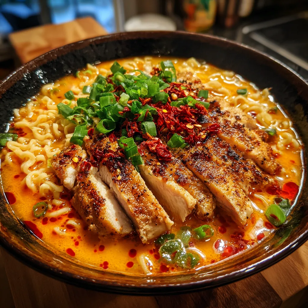 A rich and spicy ramen dish featuring tender seared chicken, a creamy garlic-infused broth, and plenty of heat, ready in under 30 minutes.