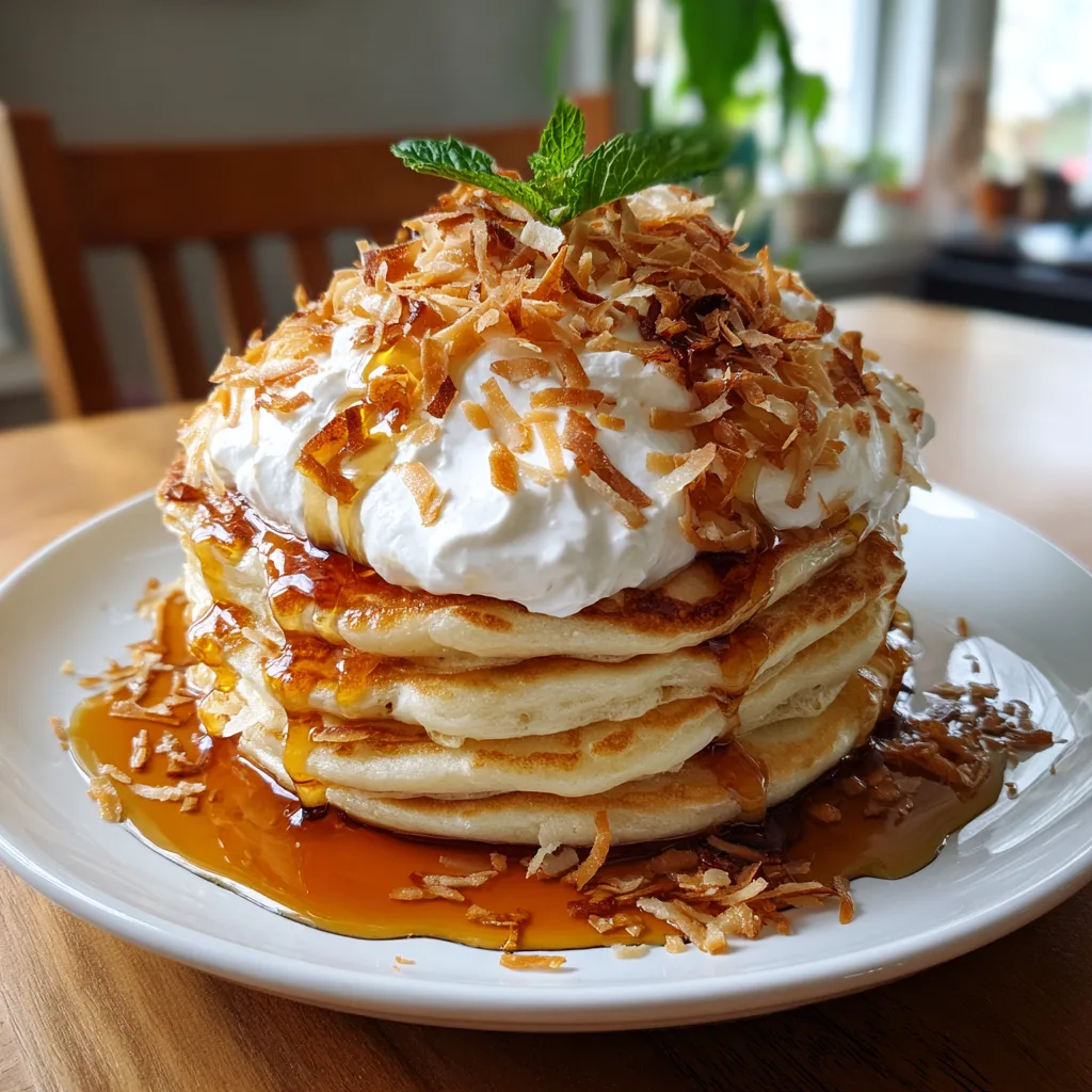 - Assemble and Serve: Stack 3 to 4 warm pancakes on a plate. Dollop a massive, generous spoonful of the whipped coconut cream right on top. Shower the entire stack heavily with the toasted coconut flakes. Drizzle generously with warm maple syrup, letting it pool around the plate. Garnish with a tiny sprig of fresh mint and serve immediately.