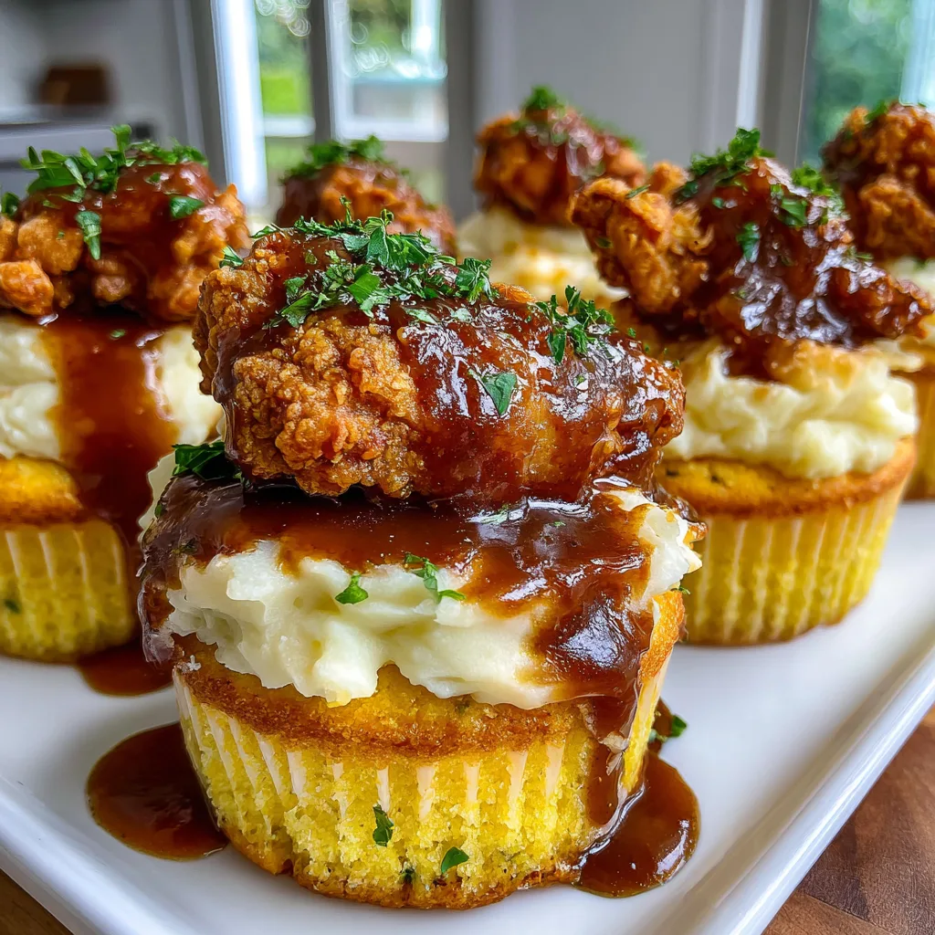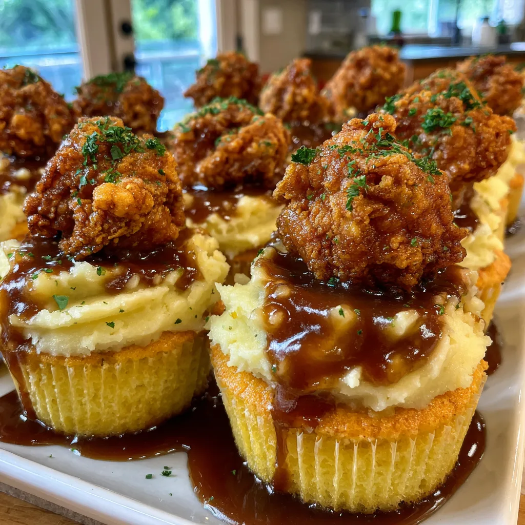 - Drizzle and Top: Drizzle the warm brown gravy over the mashed potato swirls, letting it drip down the sides nicely. Immediately place one piece of crispy fried chicken on the very top of each cupcake.