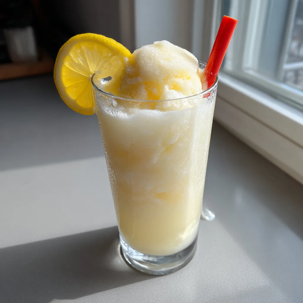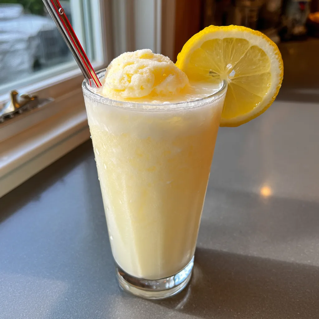 A refreshing, sweet, and tart creamy beverage made by blending freshly squeezed homemade lemonade with rich vanilla bean ice cream.