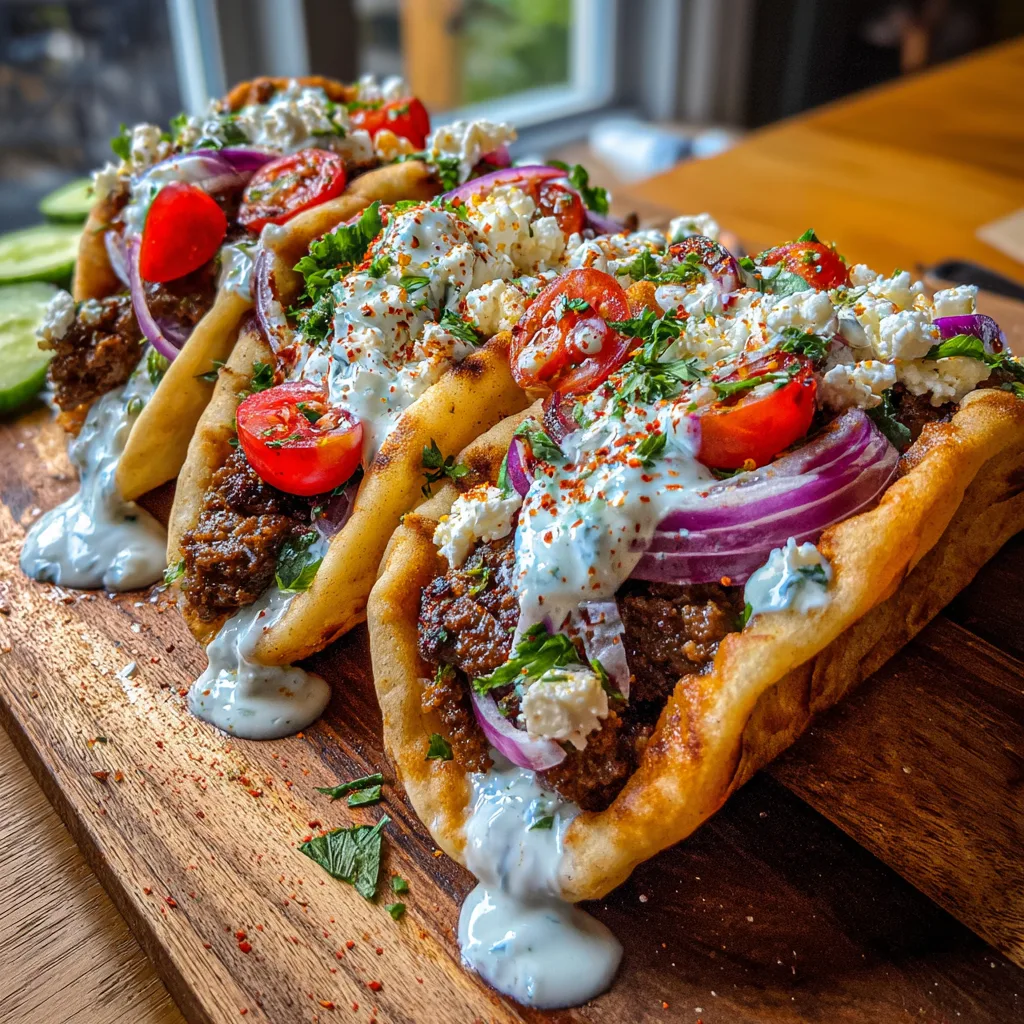Juicy, spiced ground beef served on fluffy toasted pita bread with cool tzatziki, feta, and fresh veggies. A 30-minute Mediterranean twist on taco night.