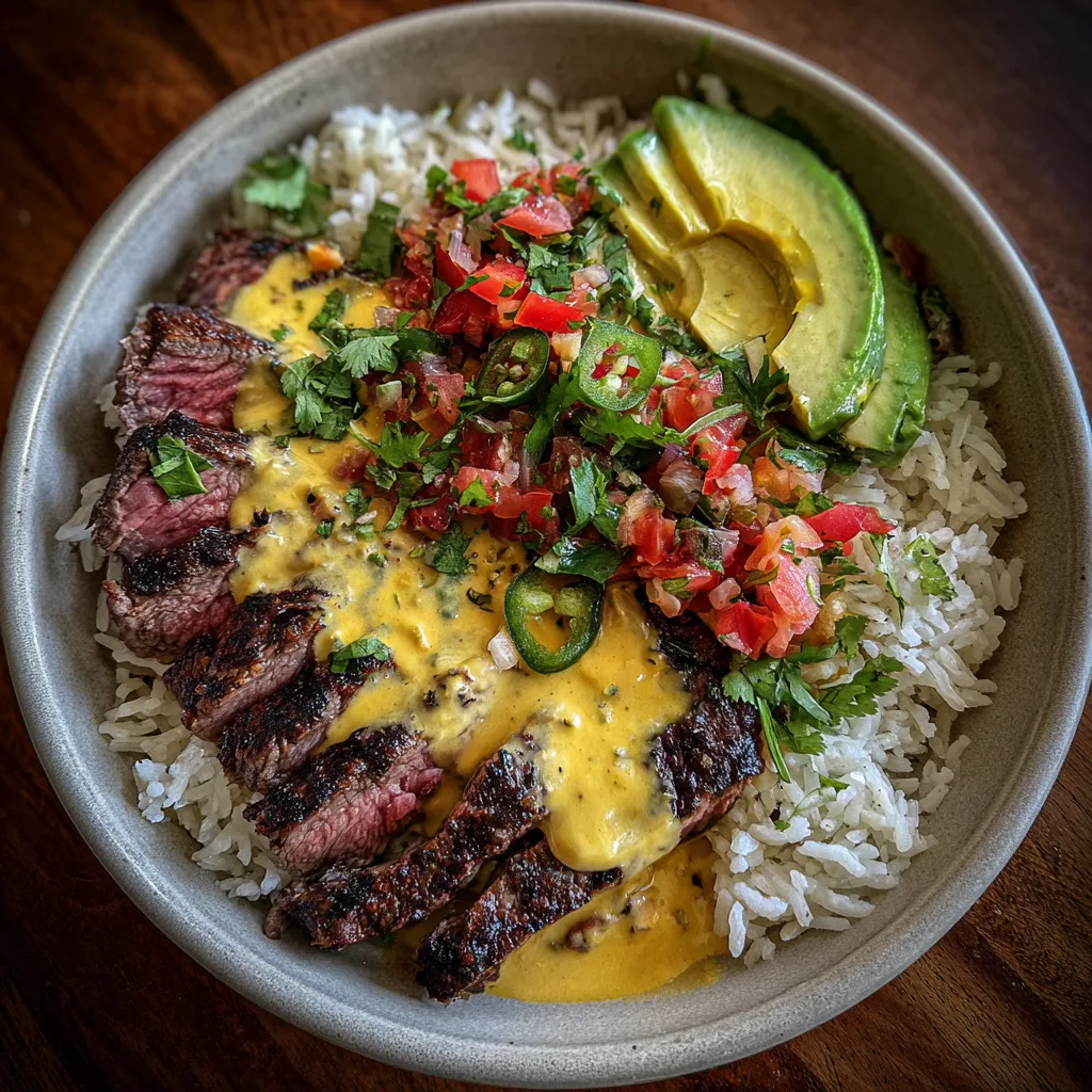 - The Final Drizzle: Drizzle the creamy chipotle sauce over the steak and toppings, letting it pool slightly in the rice for maximum flavor.