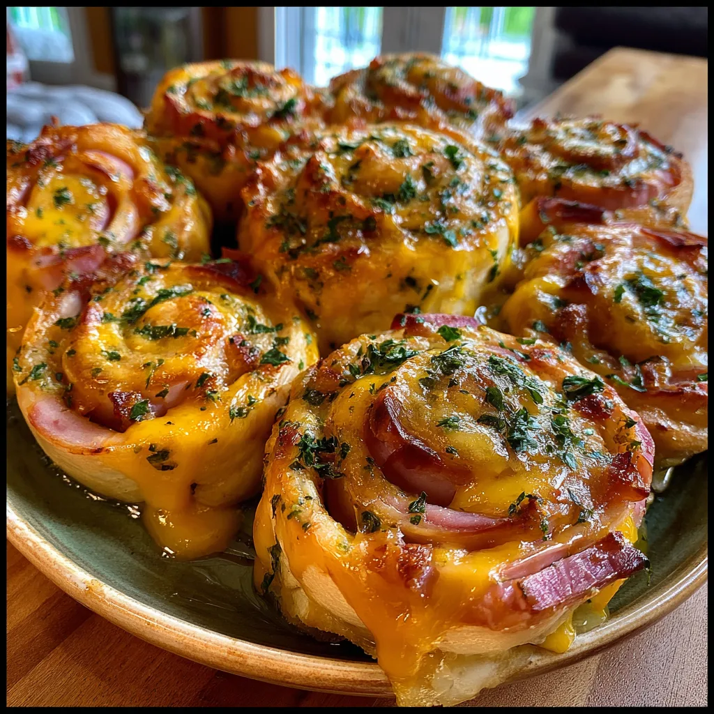 Savory deli ham and sharp cheddar cheese rolled up in a flaky pastry dough, baked until golden brown, and brushed with an irresistible garlic herb butter glaze.