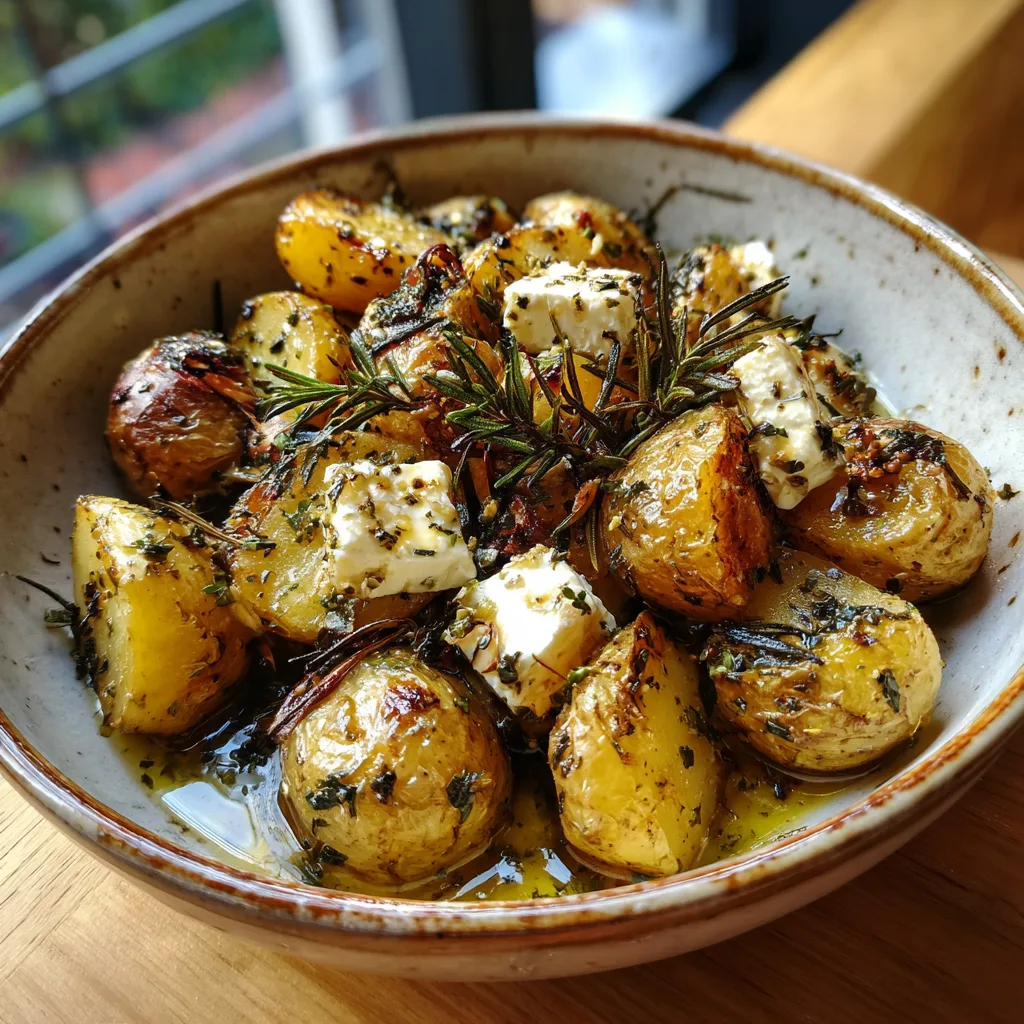 Imagine baby potatoes roasted until they are perfectly golden and crispy on the outside, yet pillowy soft on the inside. Now, picture them tossed in a glossy, sticky glaze made from honey, garlic, and olive oil, and finally topped with creamy chunks of salty feta cheese and aromatic fresh rosemary. It is a flavor explosion that looks as good as it tastes. The contrast between the hot, sweet potatoes and the cool, salty feta is absolutely addictive.
