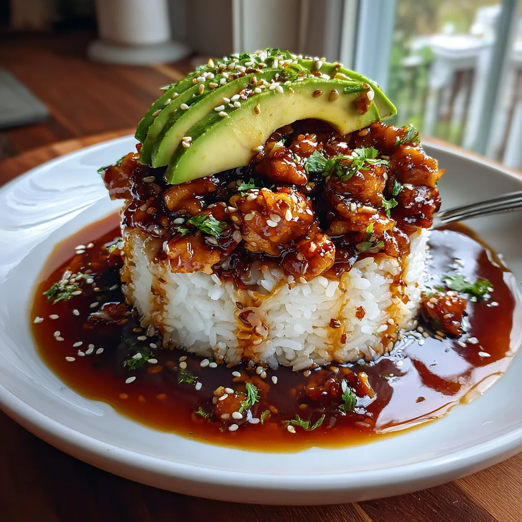 - Assemble the stack: Place a mound of rice on a plate, top with glazed chicken and pan drippings, and finish with fanned avocado slices.