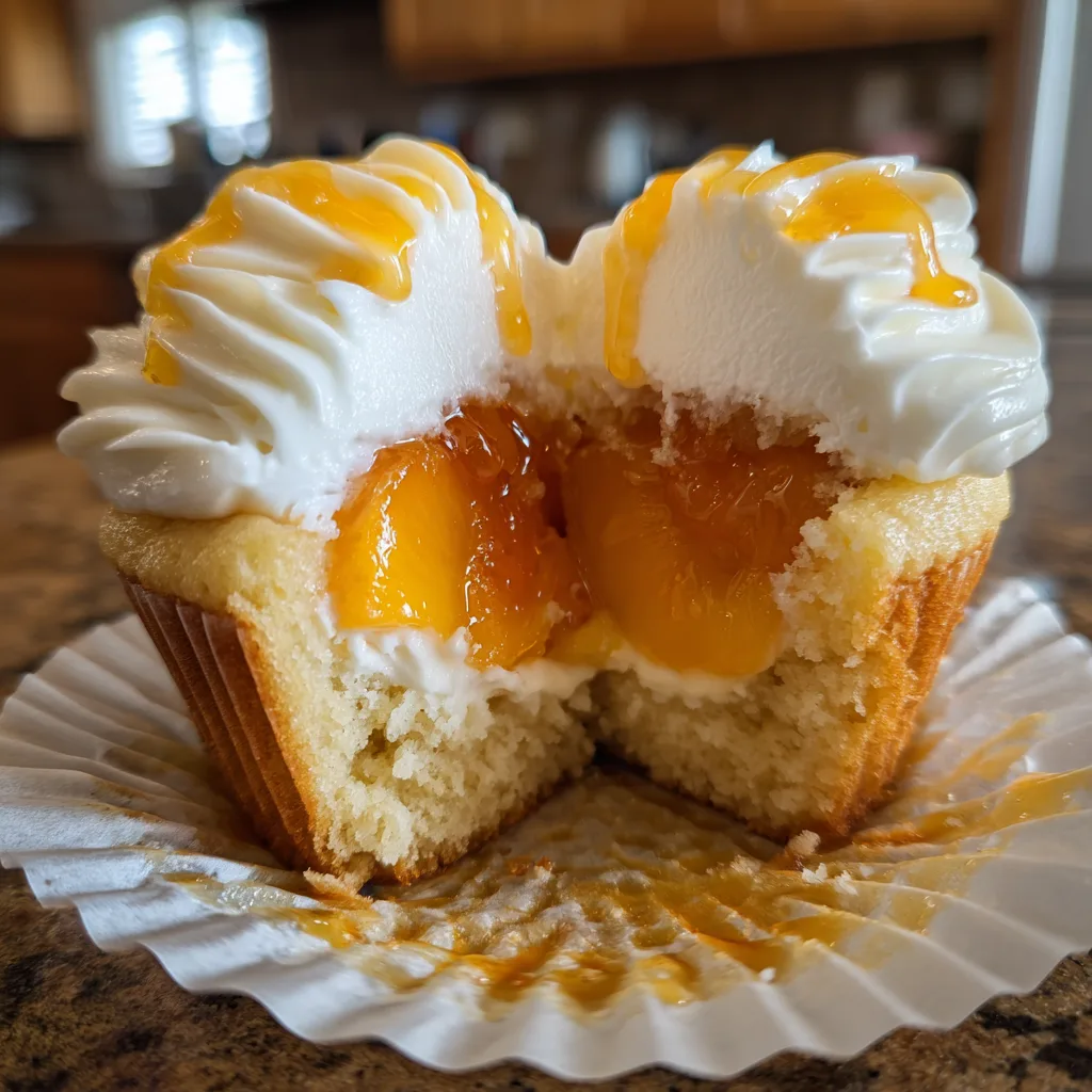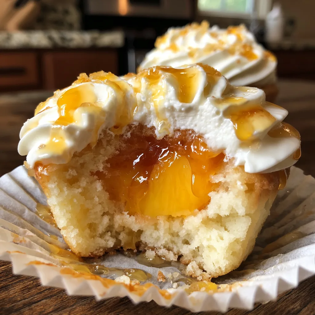 Tender vanilla cupcakes cored and stuffed with a sweet cream cheese filling and a juicy peach segment, topped with fluffy cream cheese frosting and a glossy honey drizzle.