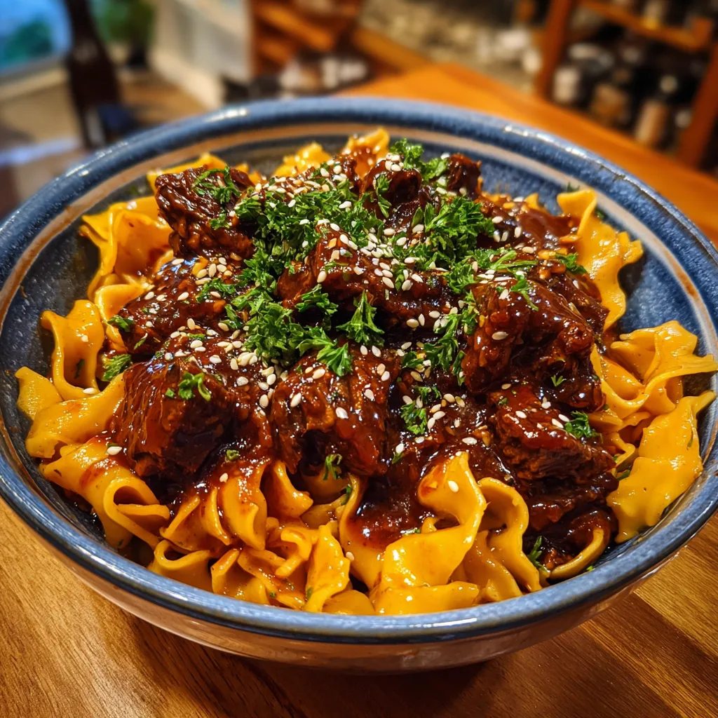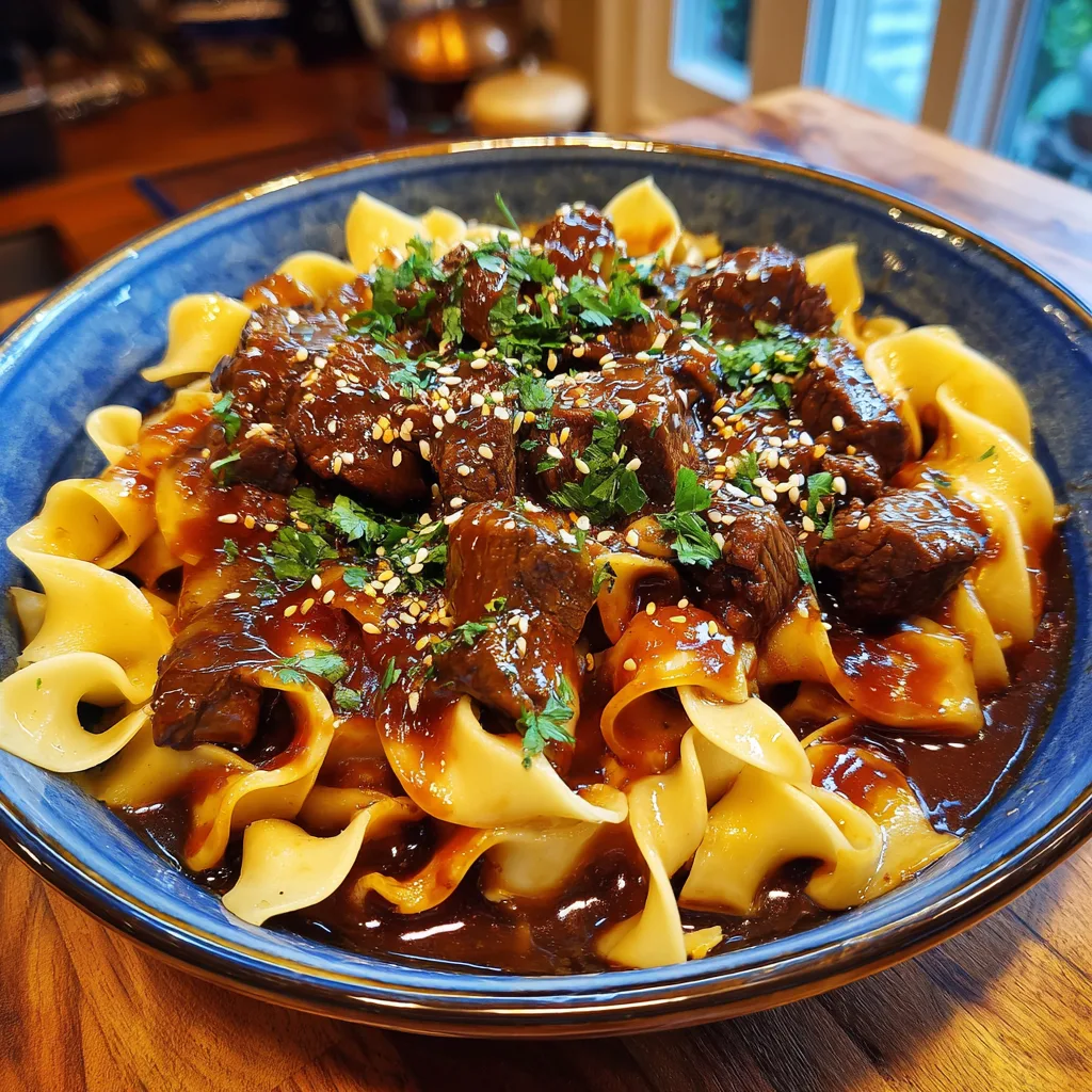 Tender strips of beef slow-cooked in a sweet and savory soy-ginger glaze, served over wide egg noodles for the ultimate comfort meal.