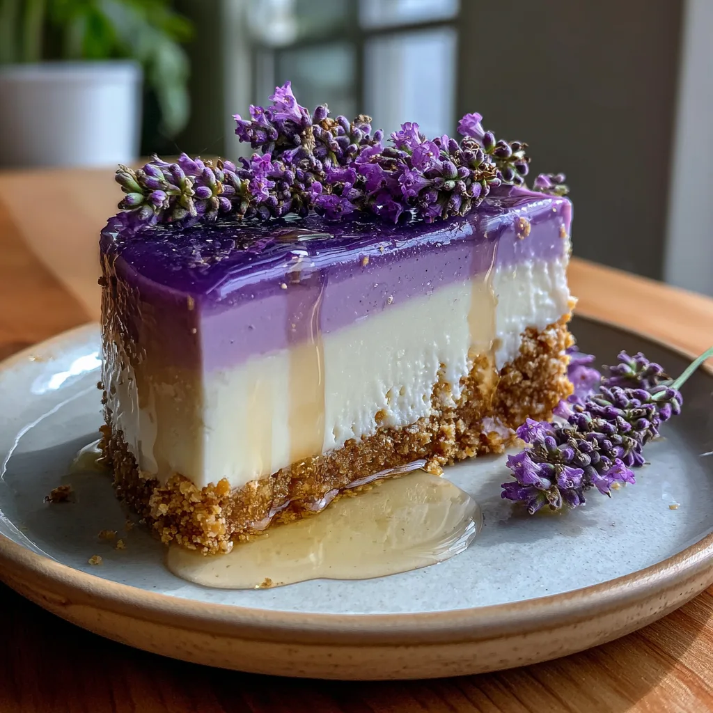 An elegant, two-toned dessert featuring a rich honey cheesecake layer and a delicate purple lavender cheesecake layer over a buttery graham cracker crust.