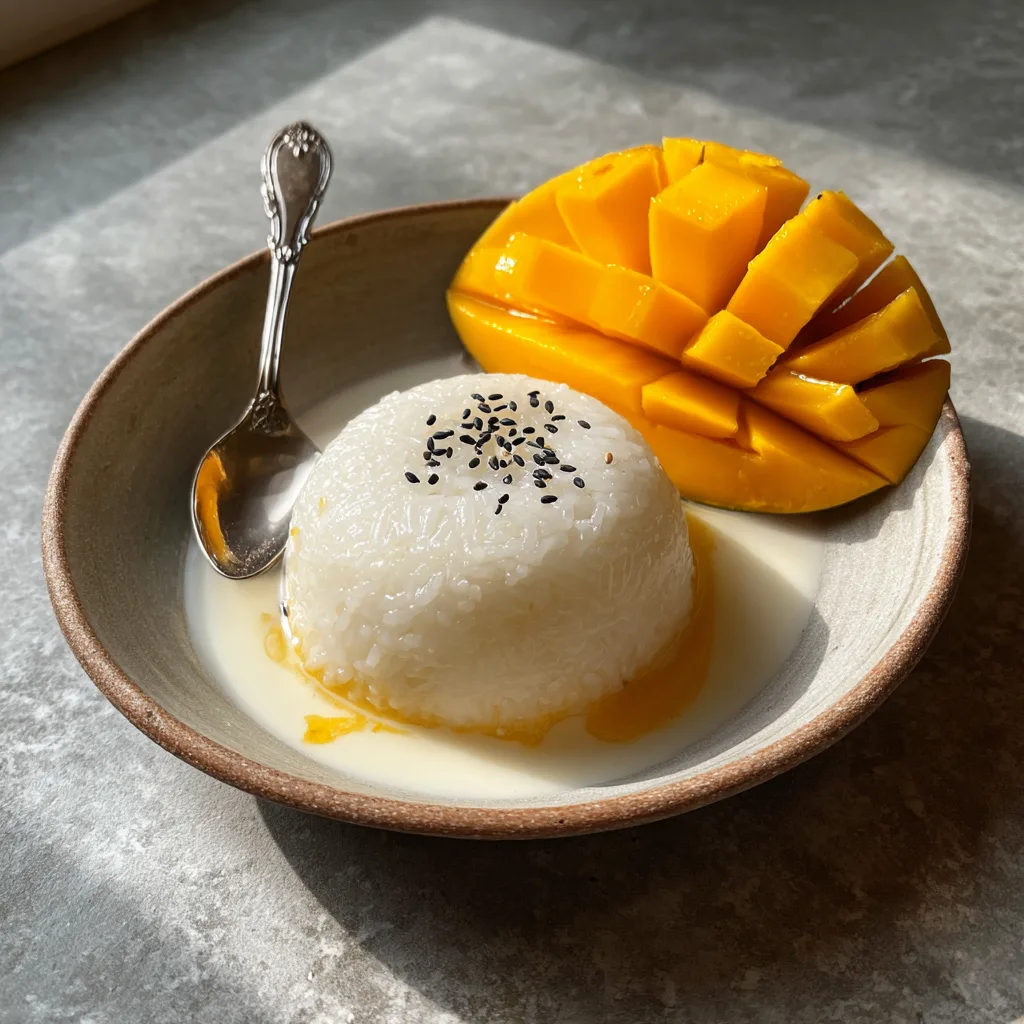 - Assemble and Serve: Scoop a mound of the warm, sweet sticky rice onto a serving plate or into a shallow bowl (you can pack it into a small bowl and invert it for a perfect dome shape). Fan the sliced mango next to the rice. Drizzle the thickened coconut topping sauce generously over the rice (and the mango, if desired). Garnish with a sprinkle of toasted black sesame seeds. Serve immediately while the rice is still warm!