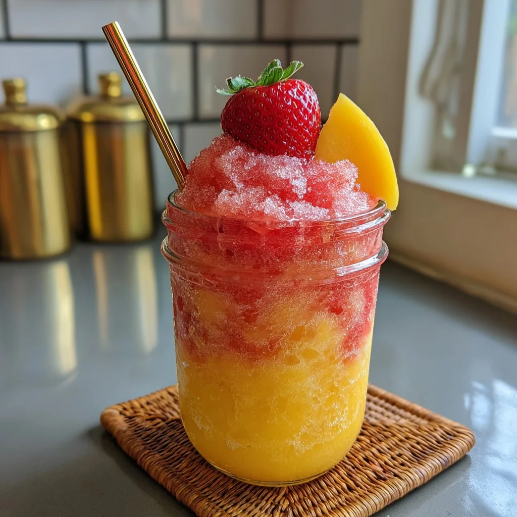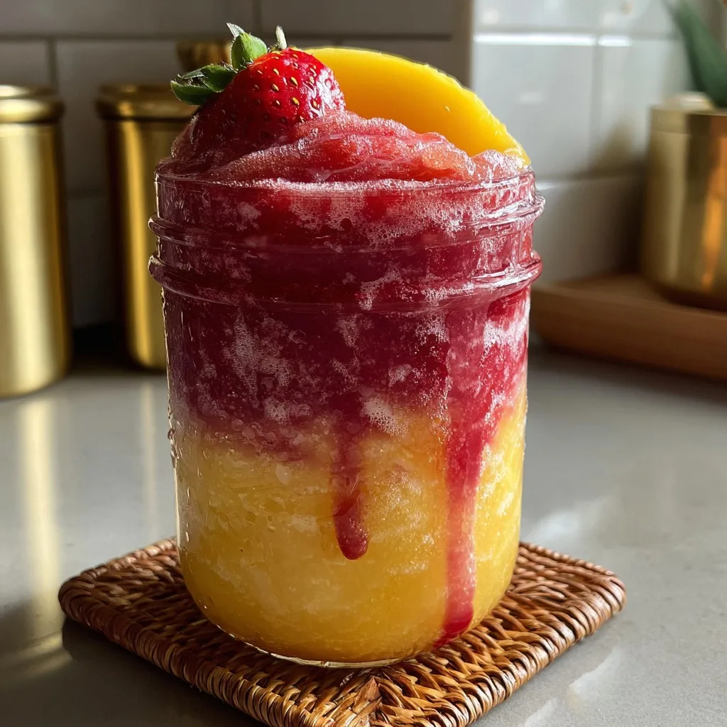 If you are serving a crowd, you can make the layers ahead of time. Blend the mango layer and store it in a large pitcher in the freezer. Do the same for the strawberry layer. When your guests arrive, simply pull the pitchers out, let them sit for 5 minutes to become pourable, and layer them right into the glasses. Serve alongside a platter of fresh summer fruit, light tea sandwiches, or savory grilled skewers for the ultimate summer feast.