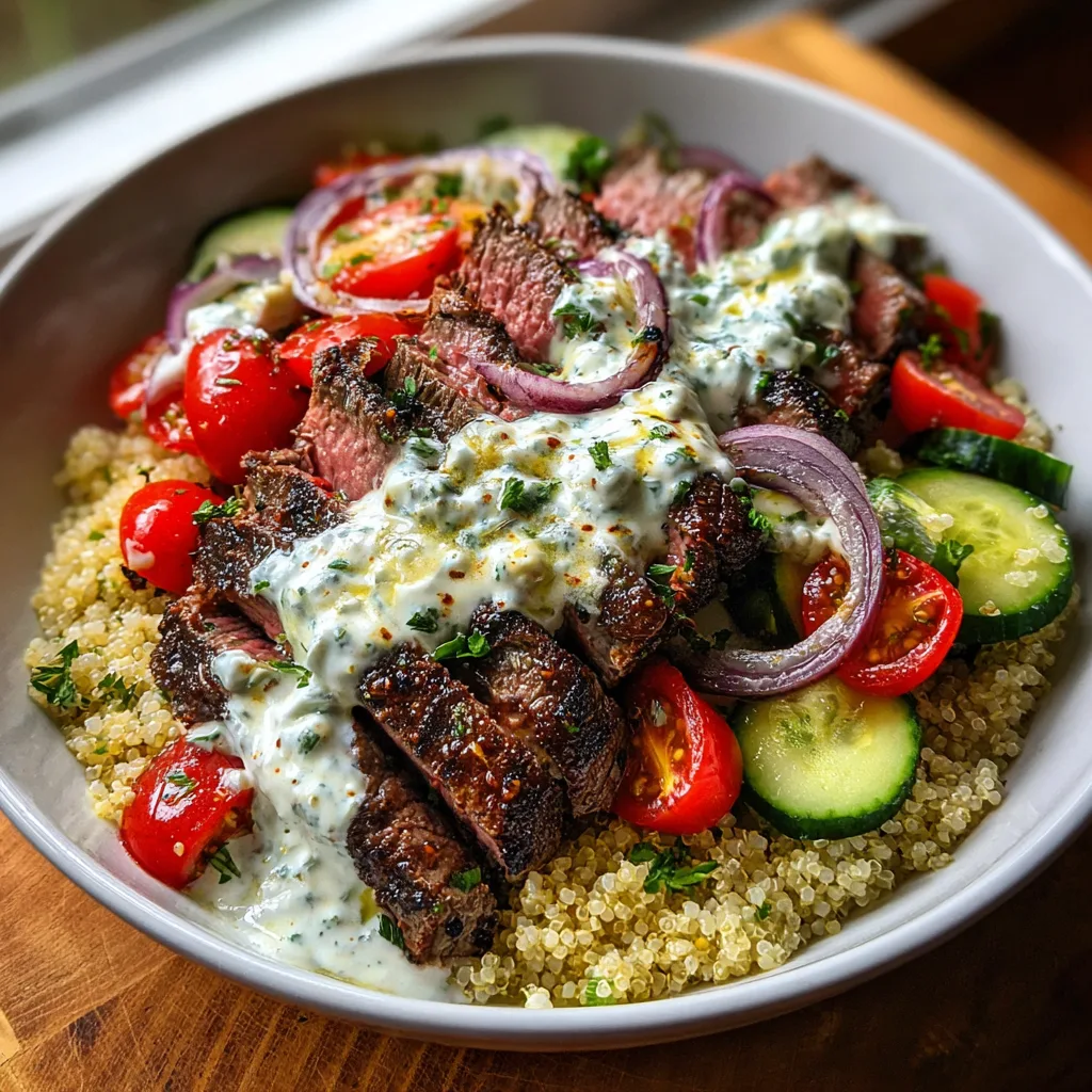 There is something undeniably satisfying about a well-constructed bowl recipe. It is the perfect marriage of textures, temperatures, and flavors, all nestled together in a way that makes every bite a unique experience. If you have been searching for a meal that feels indulgent but fuels your body with wholesome ingredients, look no further than this Mediterranean Steak Bowl. Picture this: juicy, char-grilled strips of steak, perfectly seasoned with oregano and garlic, resting atop a bed of fluffy quinoa. Beside it, the crunch of cool cucumbers, the burst of sweet cherry tomatoes, and the sharp bite of red onion create a symphony of freshness. But the real star that ties it all together? A generous dollop of homemade, creamy tzatziki sauce and a crumbling of salty feta cheese.