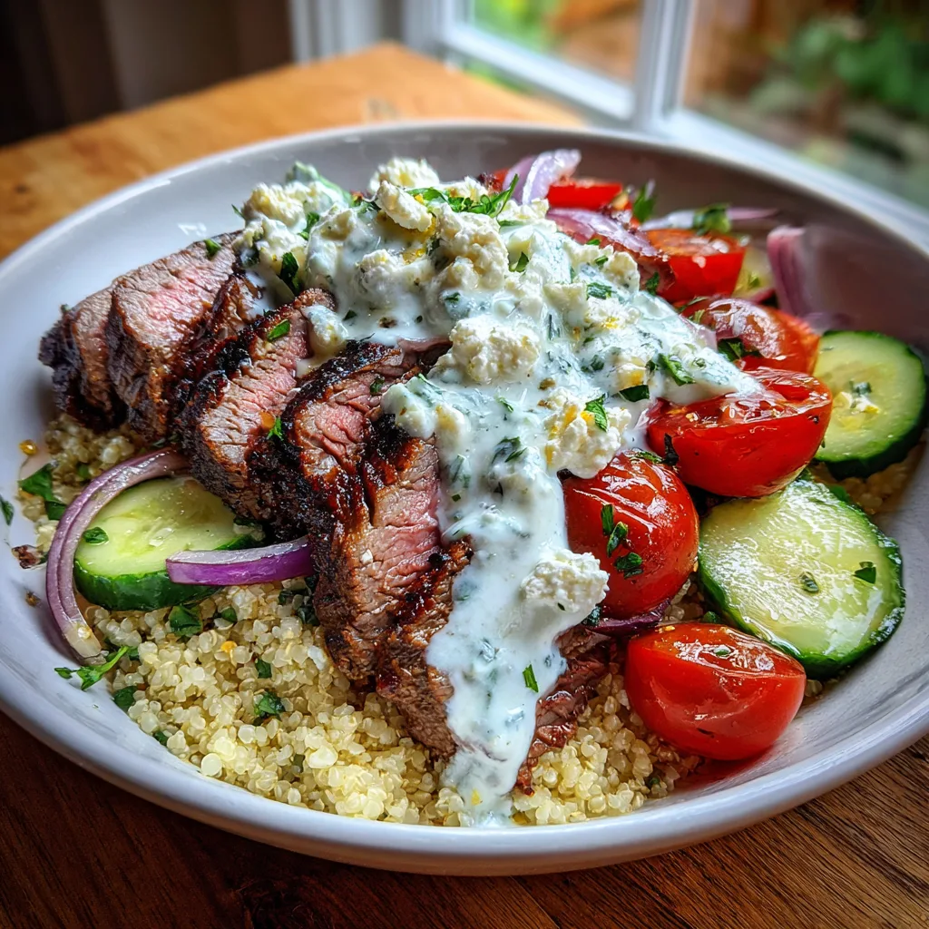 - Assemble bowls with quinoa base, topped with steak, cucumber, tomatoes, red onion, and feta.