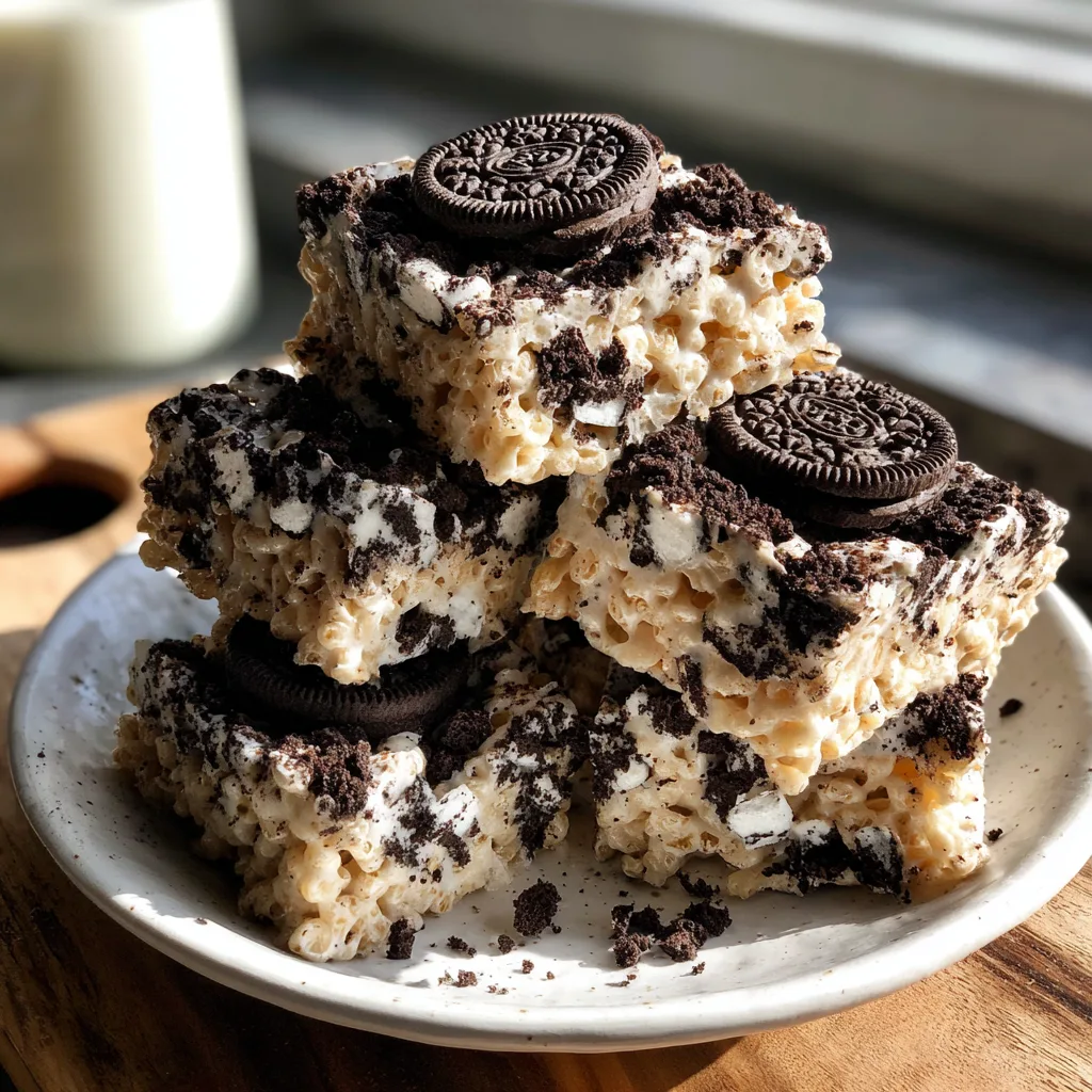 The dark cocoa powder used in the chocolate wafers of an Oreo provides a slightly bitter, deeply chocolatey crunch that breaks through the intense sweetness of the melted marshmallows. The vanilla cream filling inside the cookies melts slightly when folded into the warm cereal mixture, enriching the butter and marshmallow binder with an extra layer of vanilla flavor. Finally, a crucial pinch of sea salt added to the melted butter enhances all the flavors, preventing the bars from tasting flat or overly cloying.