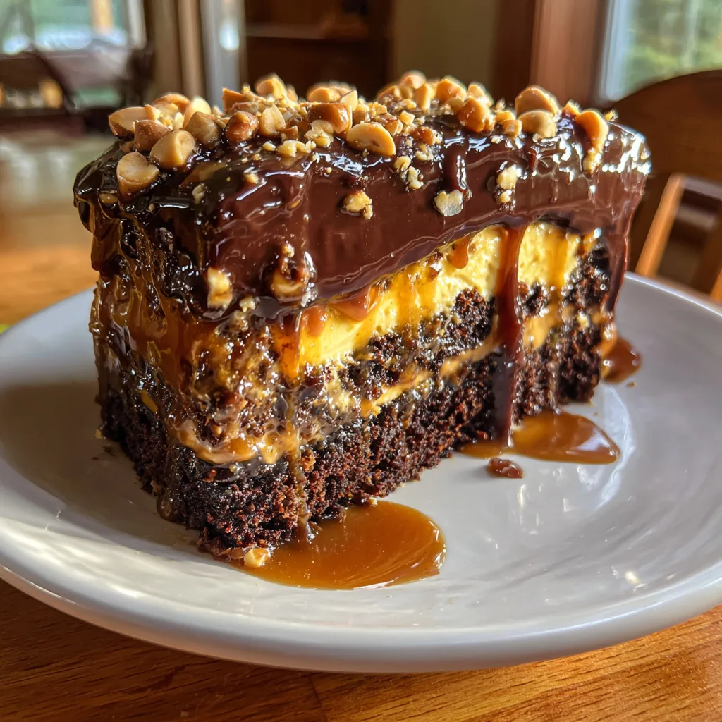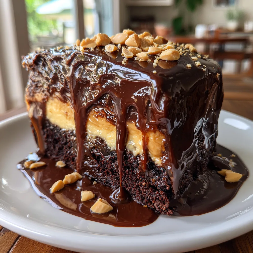 The magic of this cake lies in its distinct layers. The base is a chewy, brownie-like foundation that provides structural integrity and deep cocoa flavor. Resting on top of that is the “gooey” layer—a luscious mixture of cream cheese and peanut butter that bakes into a custard-like consistency, staying soft and creamy even after cooling. Finally, the entire masterpiece is crowned with a glossy chocolate ganache drip and a crunch of peanuts, adding a visual sheen that promises pure satisfaction.