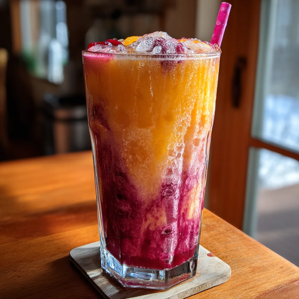 - Pour and Swirl: Pour the orange peach mixture into your serving glass first. Then, slowly pour the pink raspberry mixture directly into the center.