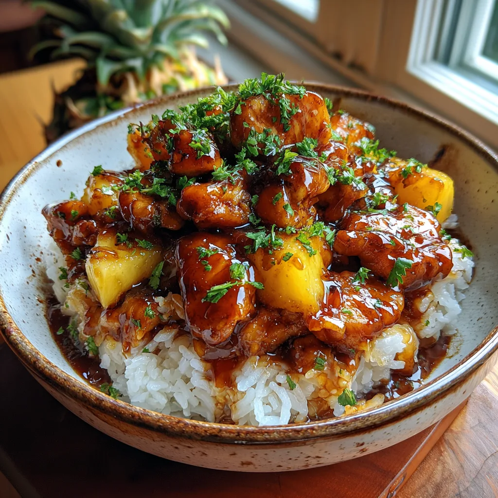 8. Garnish and Serve: Remove the skillet from the heat. Spoon generous portions of the sticky pineapple chicken over bowls of your prepared warm rice. Garnish heavily with freshly chopped cilantro or parsley to add a burst of herbal freshness that cuts through the rich sauce. Serve immediately.