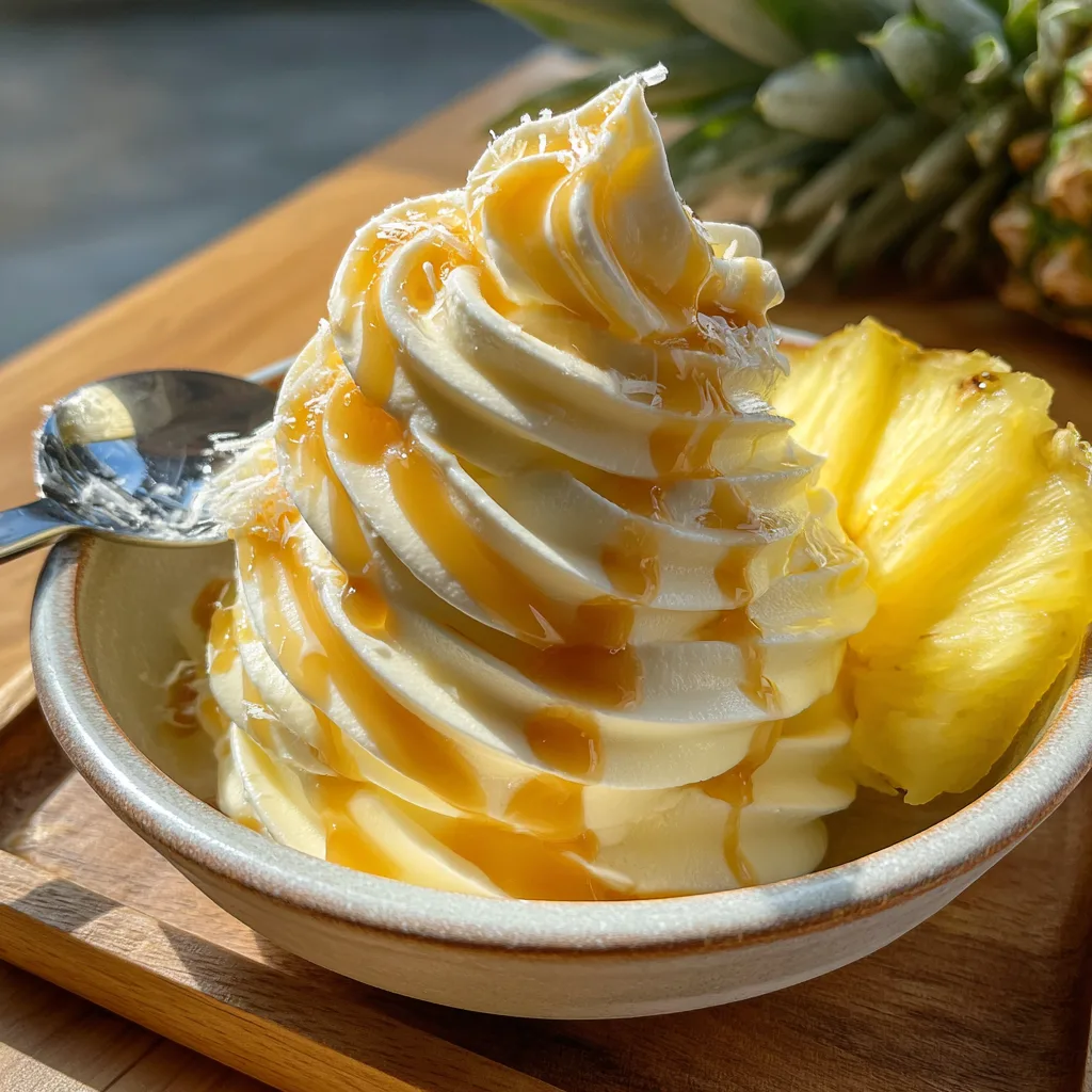 5. Serve and Enjoy Immediately: Pour or pipe the Pineapple Whip into chilled bowls or cups for the best soft-serve experience. For an authentic touch, you can even use a star tip and piping bag to create a classic swirl. Serve immediately, perhaps with a straw or spoon interaction to enjoy its creamy, glossy perfection.