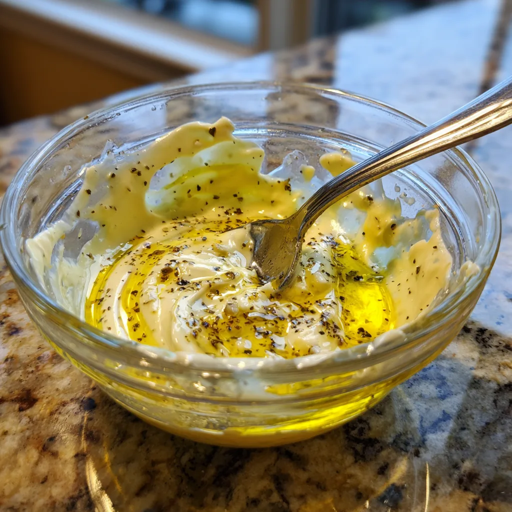 3. Mix Thoroughly: Using a spoon or a small whisk, stir the ingredients together vigorously. Ensure that the olive oil fully incorporates into the mayonnaise base and that the garlic and pepper are evenly distributed throughout the mixture.