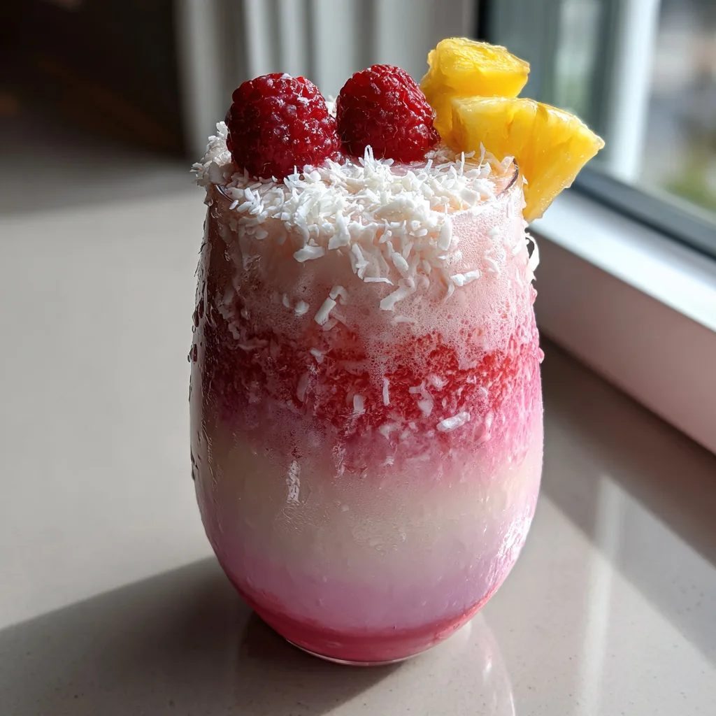 - Garnish Professionally: Sprinkle a generous pinch of white coconut flakes over the top. Take two fresh raspberries and place them gently on the surface so they float. Finally, take a small wedge of fresh pineapple, cut a small slit in the fruit, and slide it onto the rim of the glass.