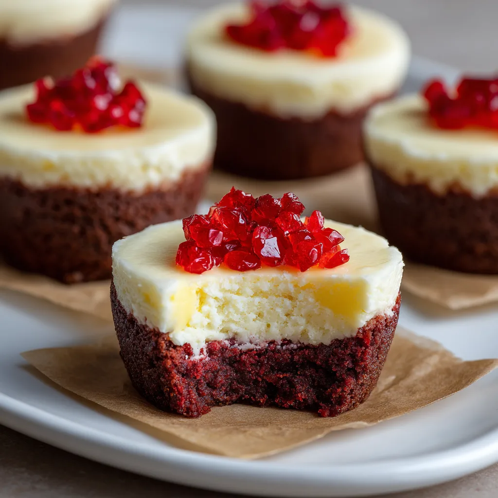 Decadent, bite-sized desserts featuring a rich red velvet brownie base topped with a smooth, creamy vanilla cheesecake layer.