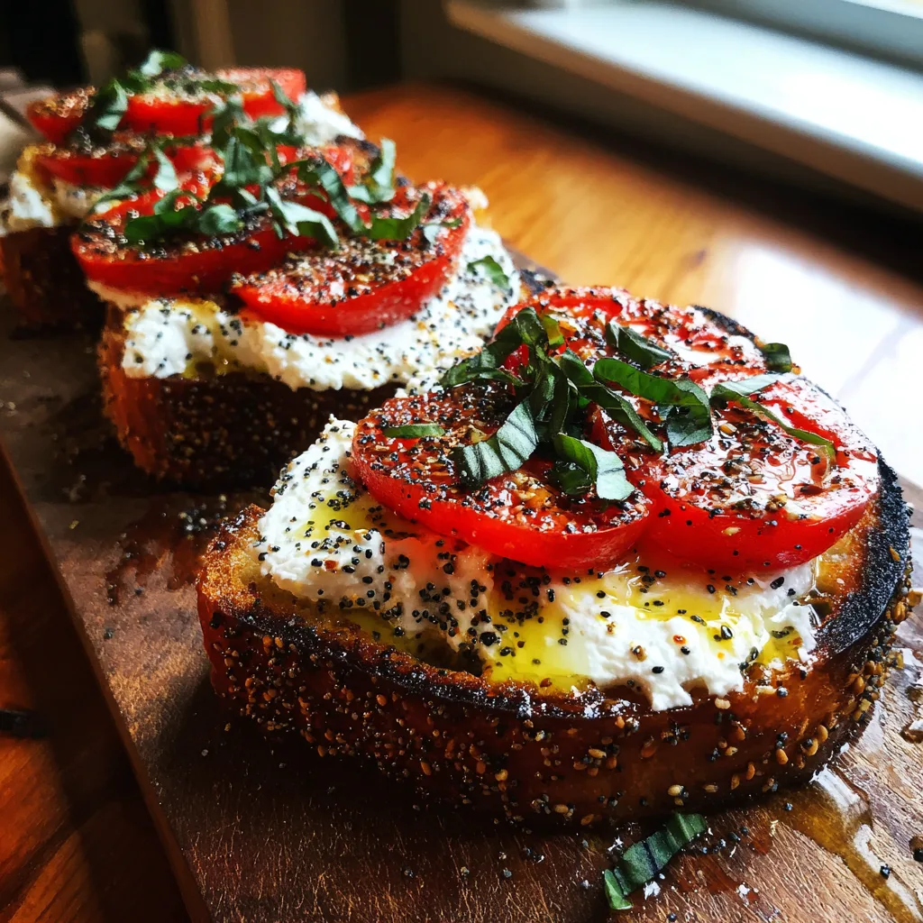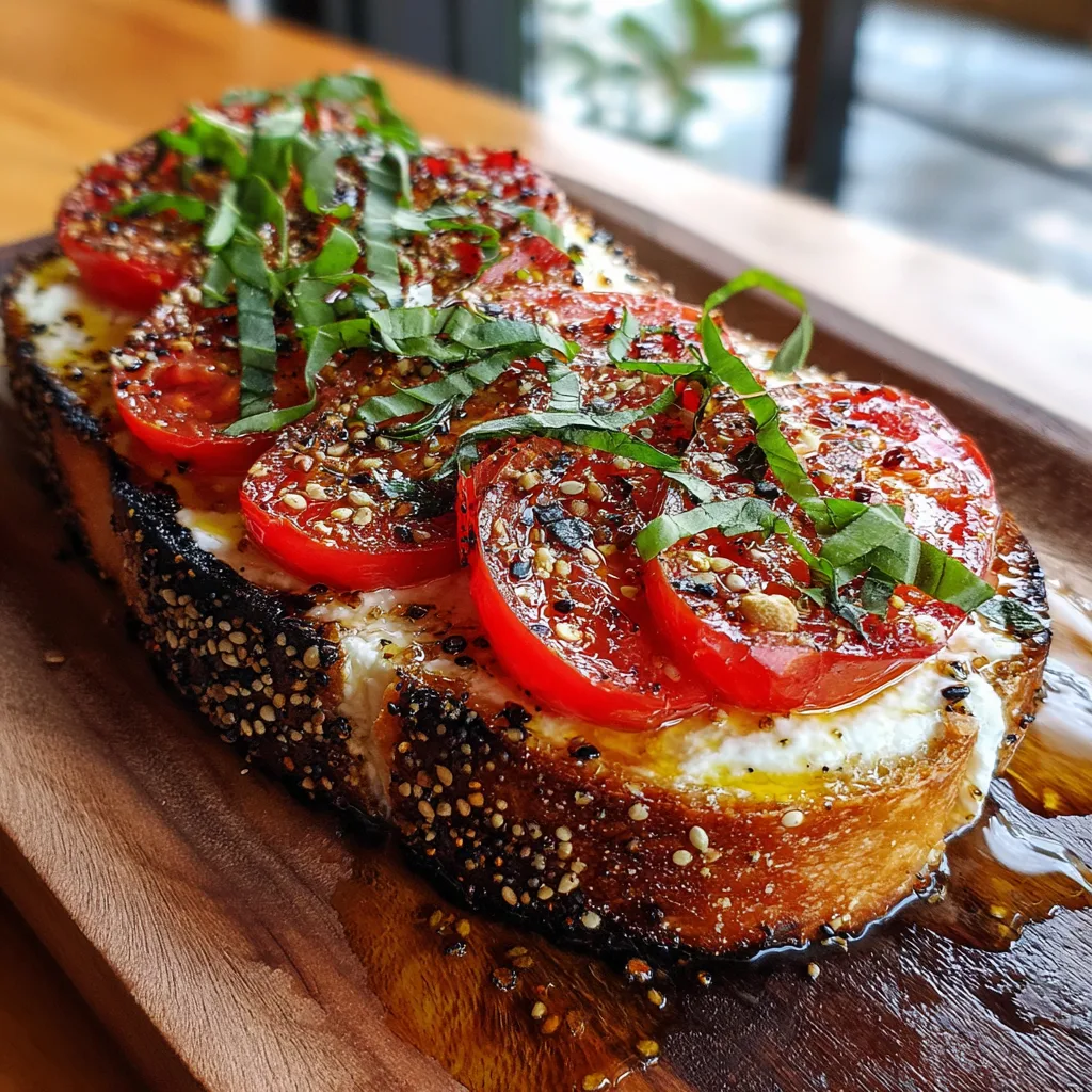 - Season and Garnish: Sprinkle the “Everything Bagel” seasoning (or salt/pepper/chili flakes) over the tomatoes. Scatter the fresh basil on top.