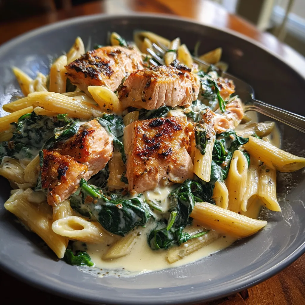 A rich and comforting dish featuring perfectly seared salmon chunks, tender penne pasta, and fresh spinach tossed in a luxurious garlic cream sauce.