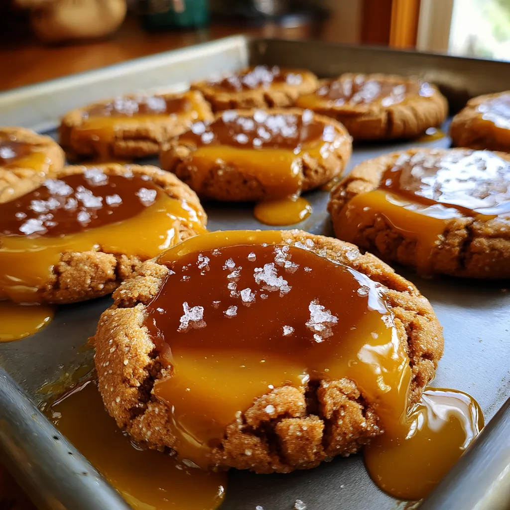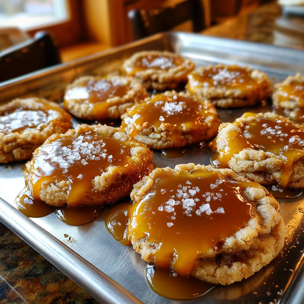 Thick, soft, and chewy cookies featuring a buttery brown sugar dough, topped with a gooey pool of melted caramel and a sprinkle of flaky sea salt.