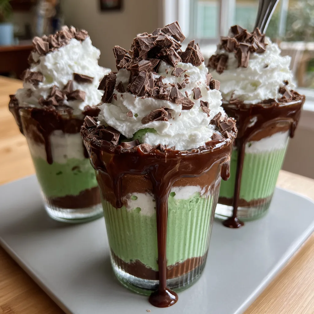 - Layering the Cups: Set out 4 to 6 clear glass serving cups (ribbed glasses look especially beautiful). Spoon or pipe the green mint pudding evenly into the bottom of each cup, filling them about one-third of the way full. Gently tap the cups on the counter to level the pudding.