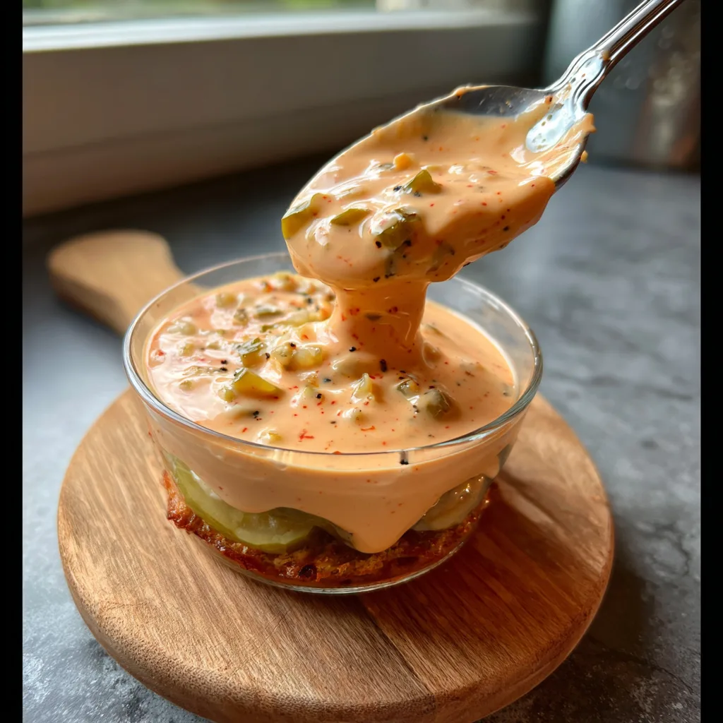 There is a reason why almost every famous burger chain has its own version of a “secret sauce.” A plain burger with just ketchup and mustard is fine, but a custom-blended sauce elevates the culinary experience to an entirely new level. The beautiful light orange-pink hue of this sauce, dotted with vibrant green specks of chopped pickles and dark flecks of spices, is a visual promise of the flavor explosion to come. Whether you are hosting a backyard barbecue, making a quick weeknight dinner, or trying to replicate your favorite fast-food order, this recipe is guaranteed to become a permanent fixture in your culinary repertoire.