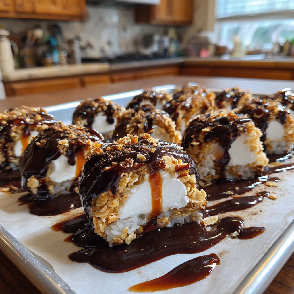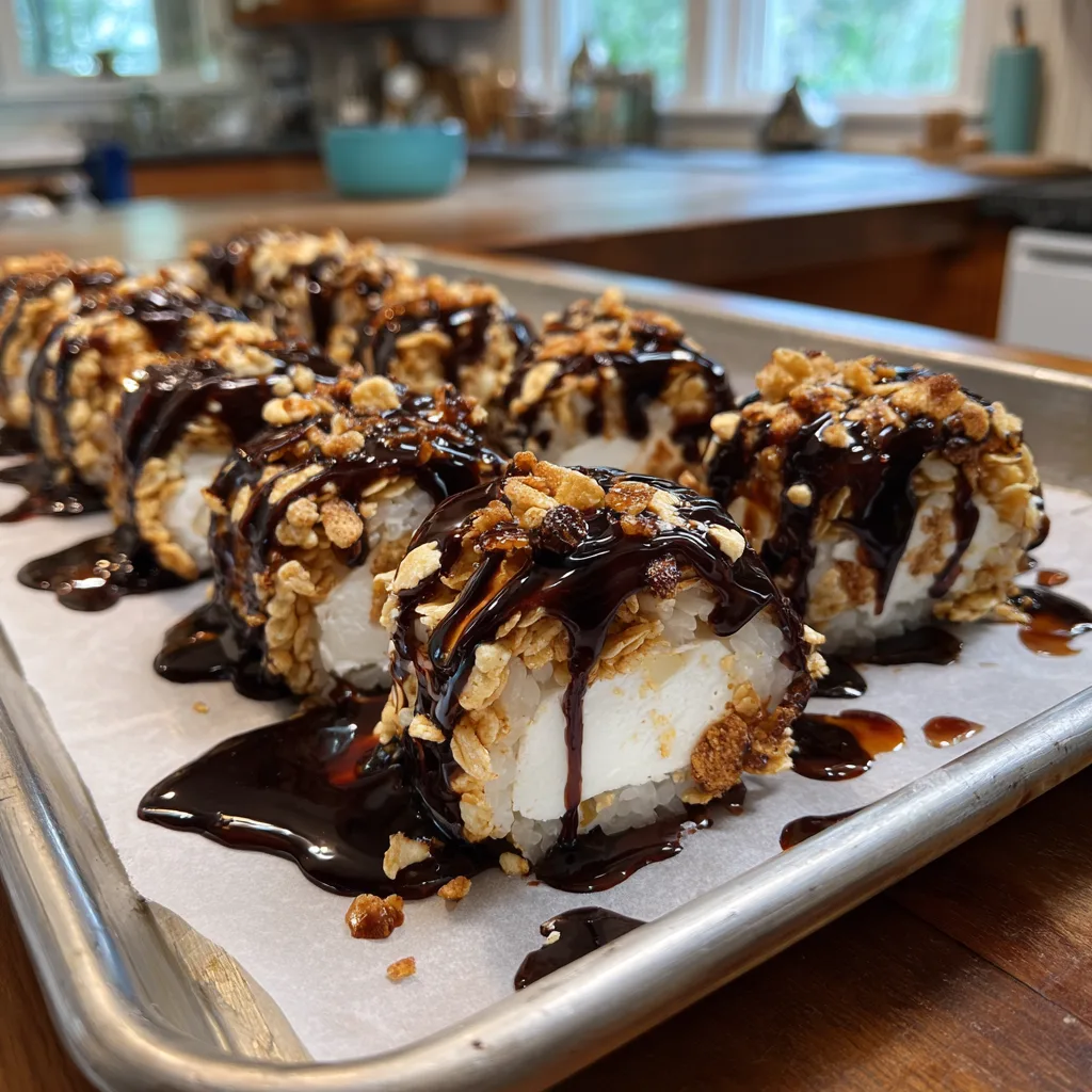 Instead of sticky rice, the “rice” layer is created using a classic crispy cereal treat mixture—specifically, Rice Krispies (or a similar toasted rice cereal) bound together with melted butter and mini marshmallows. Instead of nori (seaweed), the outer coating relies on the texture of the cereal. The “filling” consists of a thick, luxurious layer of marshmallow fluff and a solid core of rich, dark or semi-sweet chocolate. Once assembled flat, the entire concoction is rolled up tightly into a log, chilled until firm, and then sliced into perfect, bite-sized “sushi” rounds. The final touch? A heavy, glossy drizzle of melted chocolate syrup over the top, mimicking soy sauce or eel sauce, adding that final punch of cocoa flavor and visual decadence.